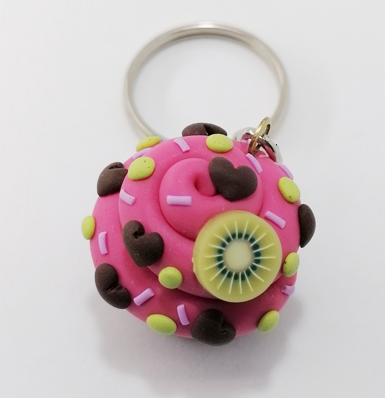 Stainless steel keychain with hand sculpted clay cupcake colour fuxia with slice of kiwi and sprikles.