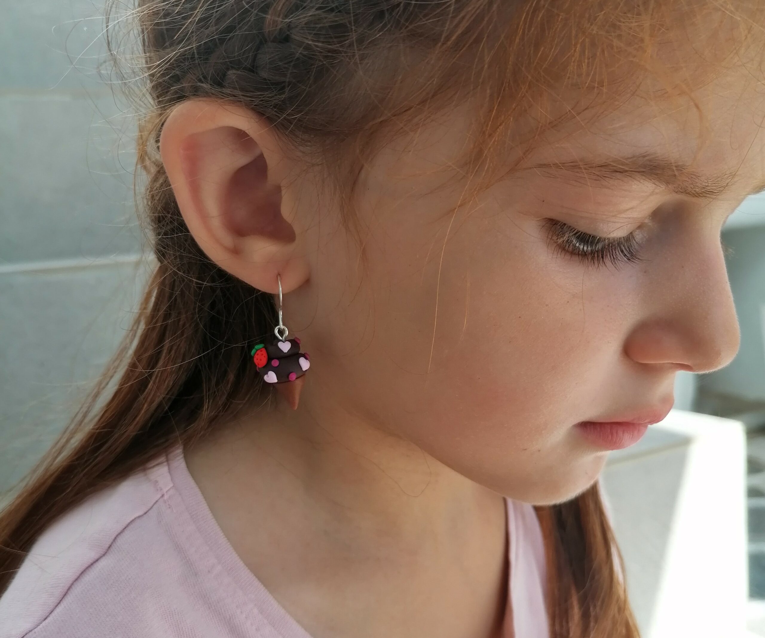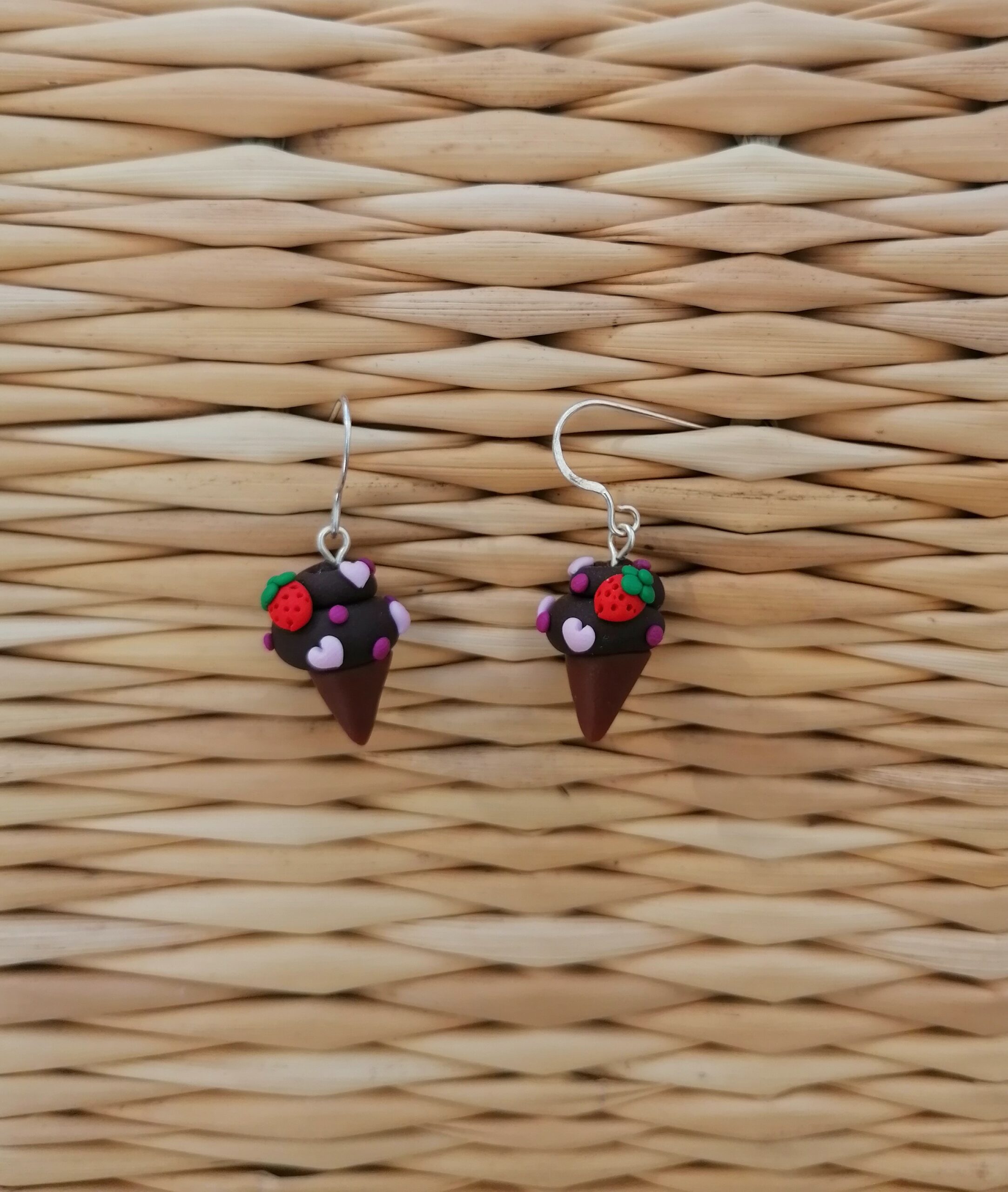 Pendant earring with hand sculpted miniature clay ice cream cone chocolate and strawberries. The earring hooks are in 925 sterling silver.