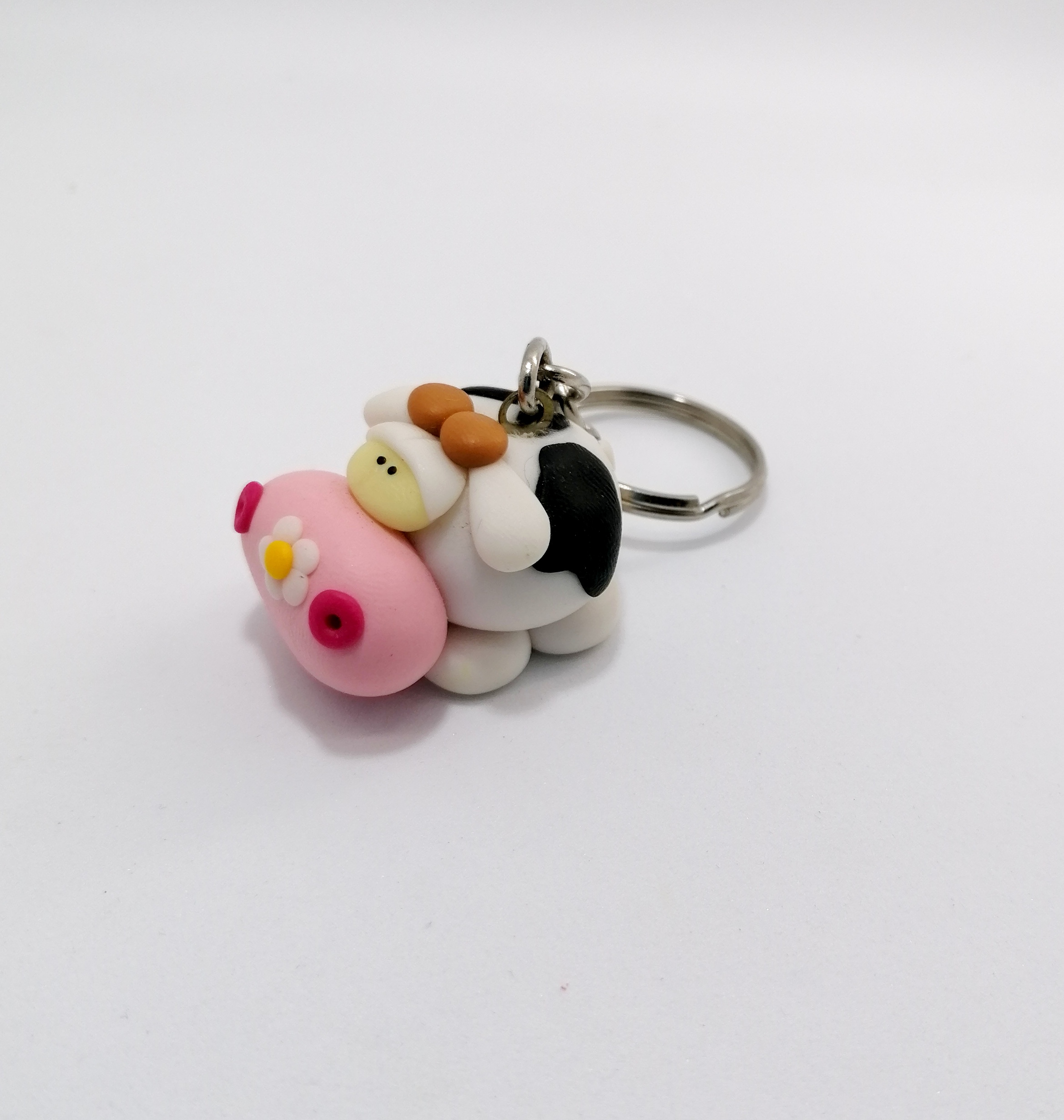 Stainless steel keychain with hand sculpted clay cow with flower.
