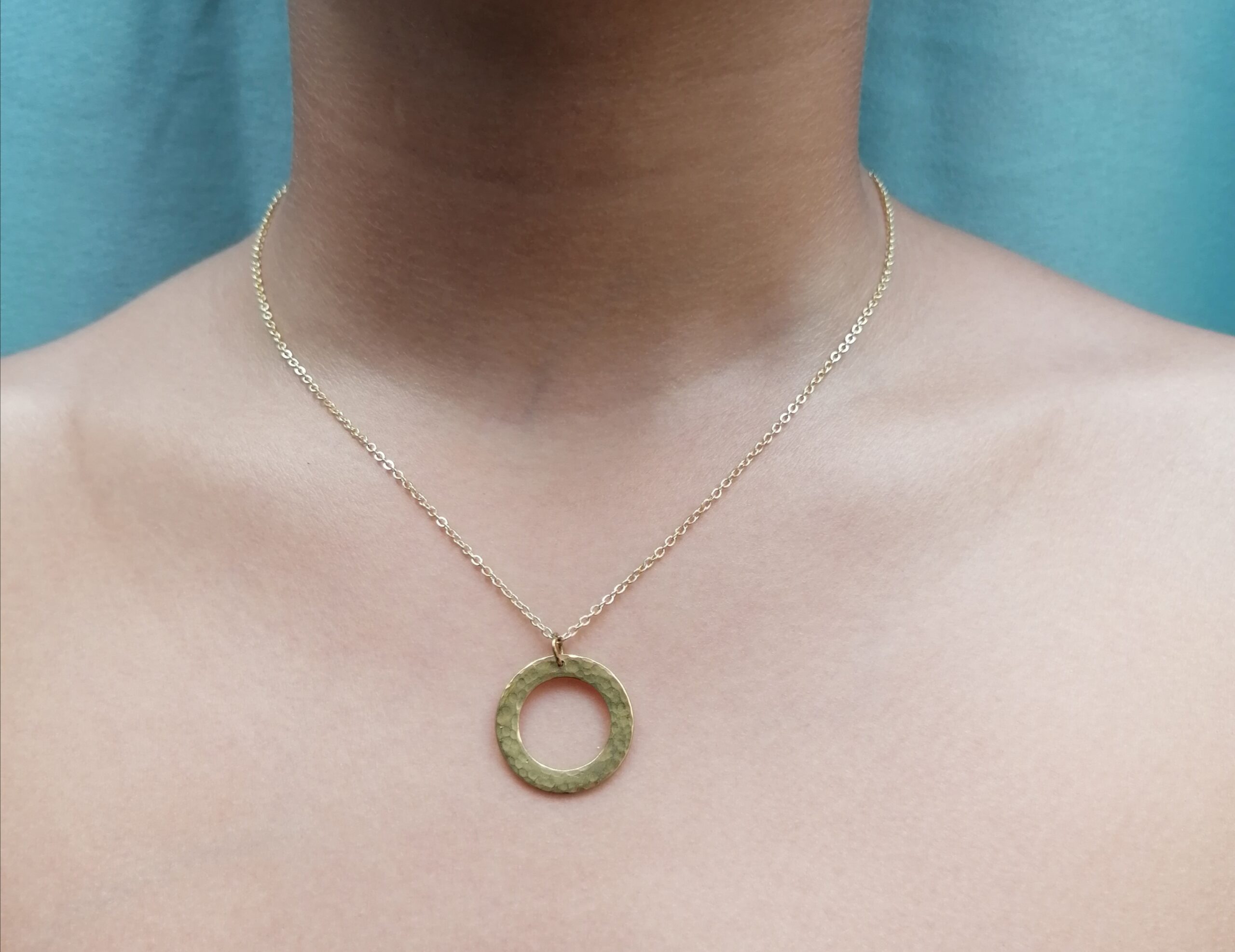 Χειροποίητο κολιέ με ορειχάλκινο κύκλο, σφυρηλατημένο στο χέρι σε χρυσαφί ατσάλινη αλυσίδα.