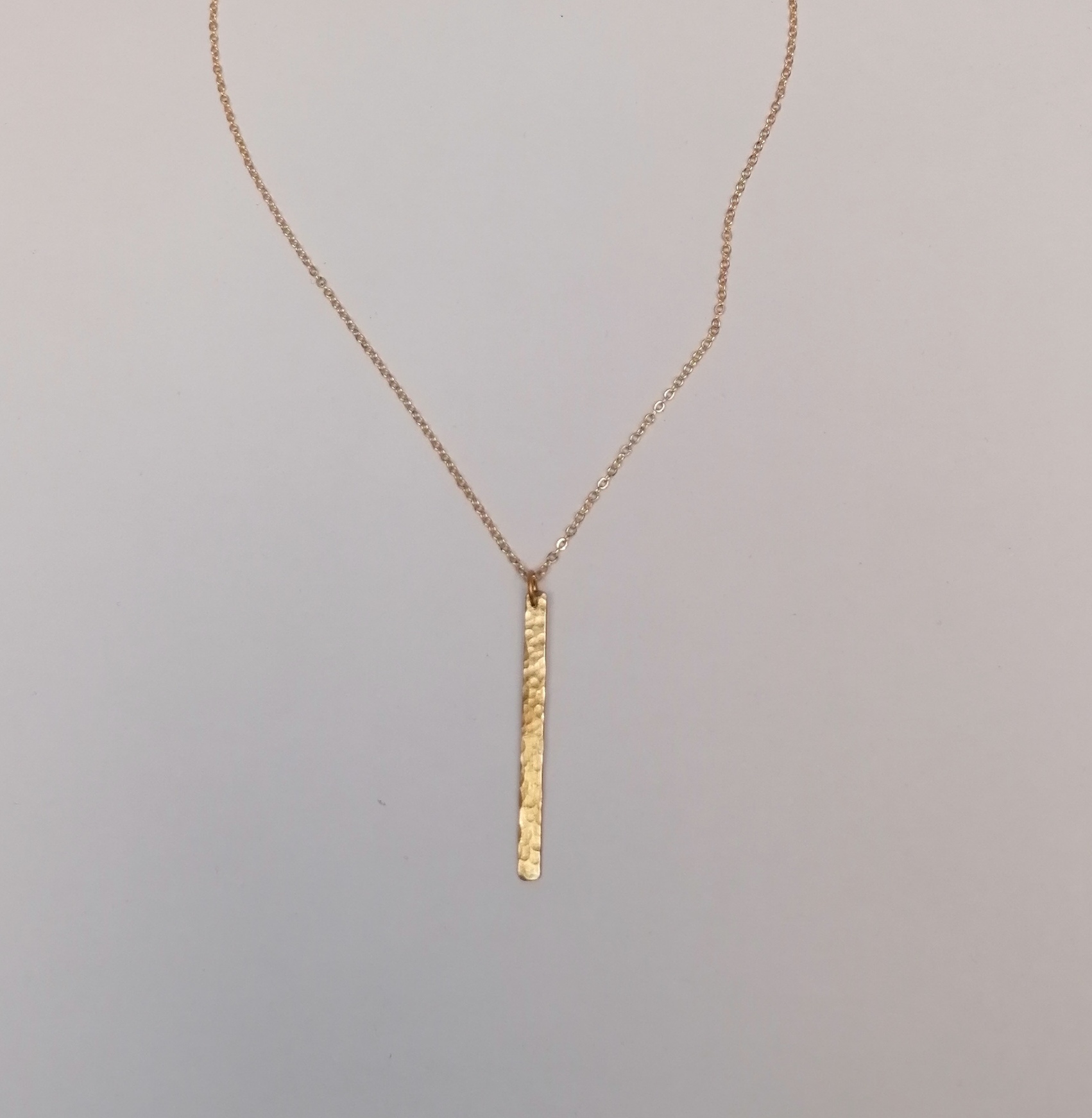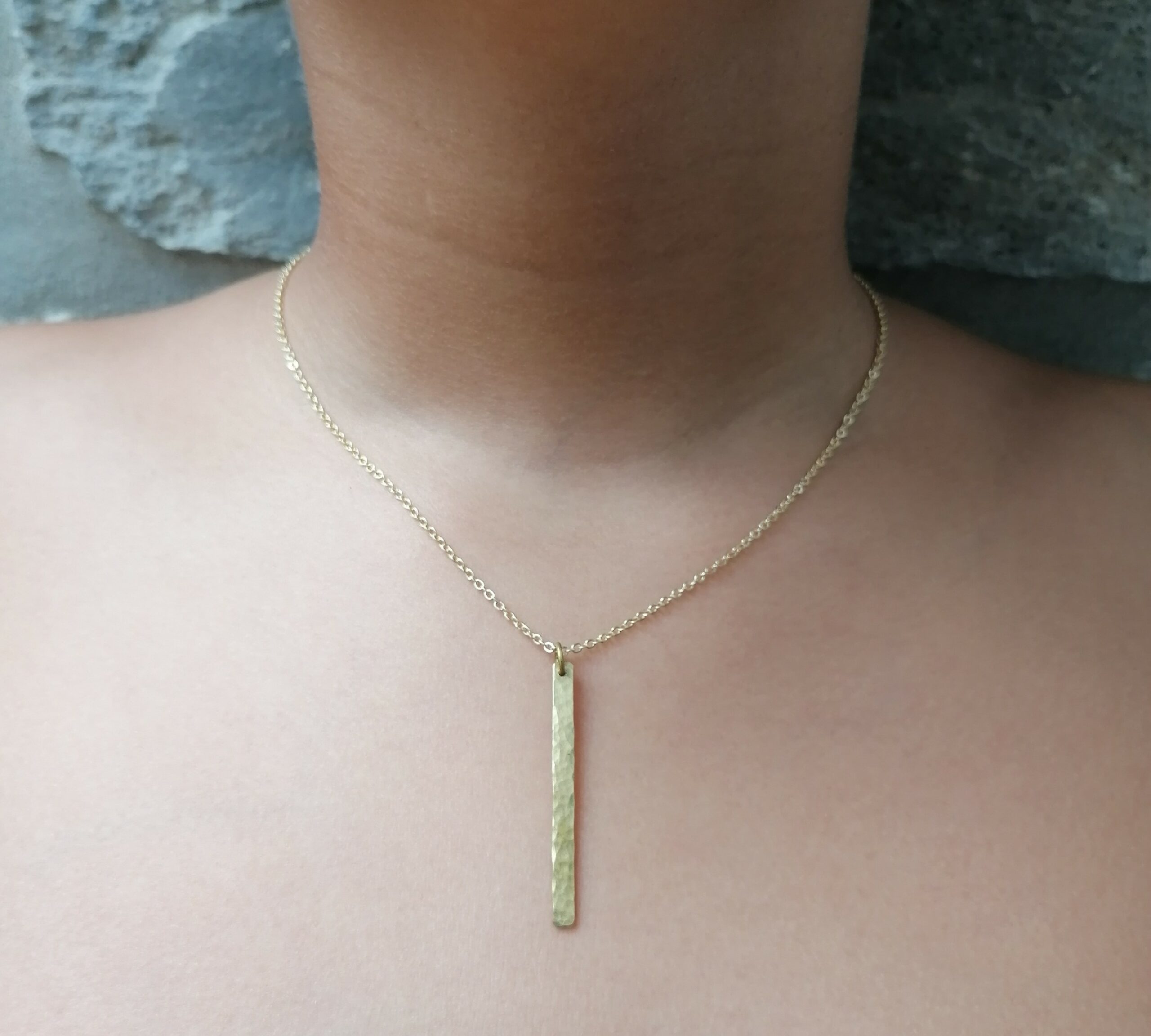 Χειροποίητο κολιέ με λεπτό ορθογώνιο ορειχάλκινο στοιχείο, σφυρηλατημένο στο χέρι.
