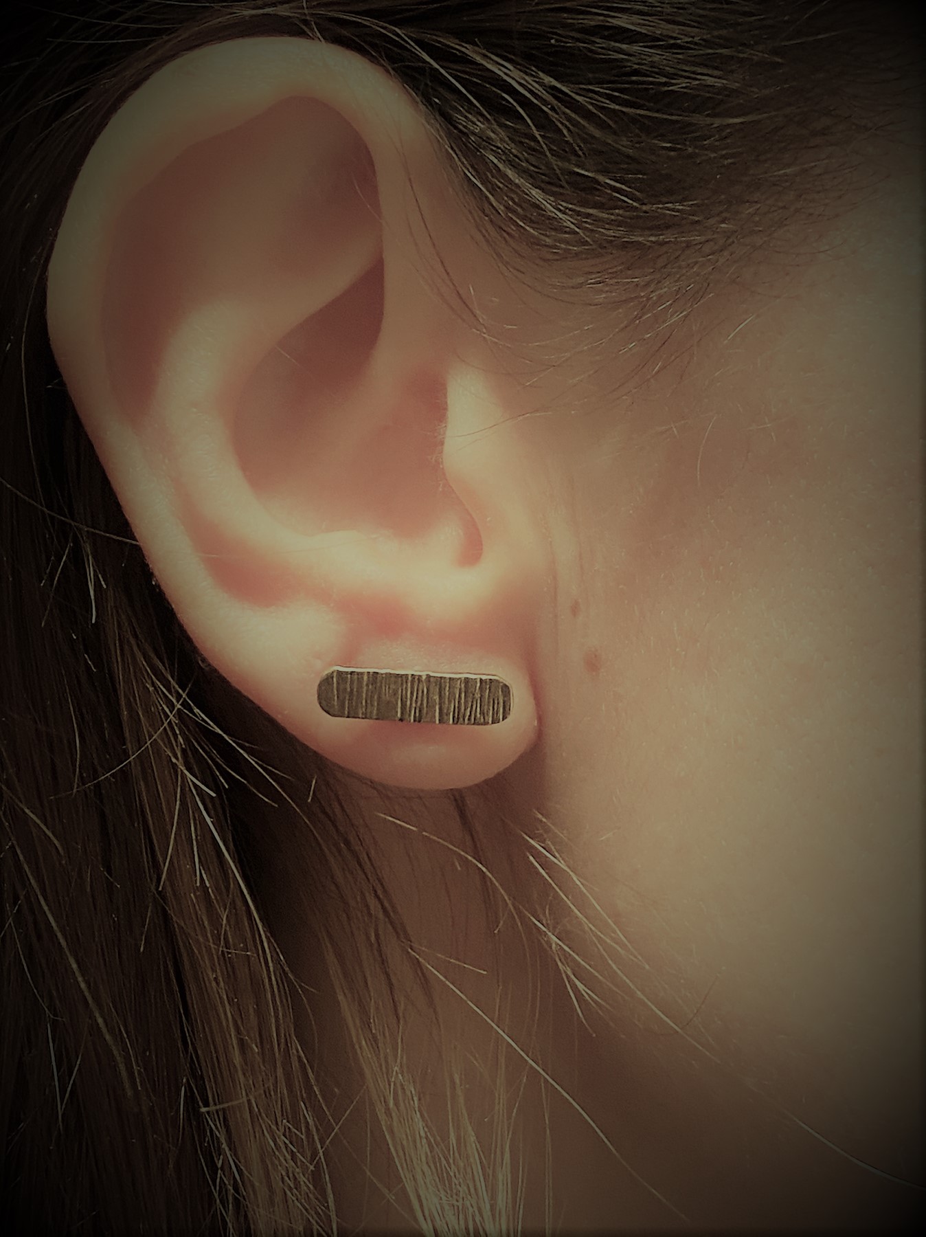 Χειροποίητα σκουλαρίκια λοβού, ορειχάλκινες μπάρες με γραμμές, σφυρηλατημένα στο χερι. Το καρφάκι που μπαίνει στο αυτί και το κούμπωμα είναι απο ασήμι 925.