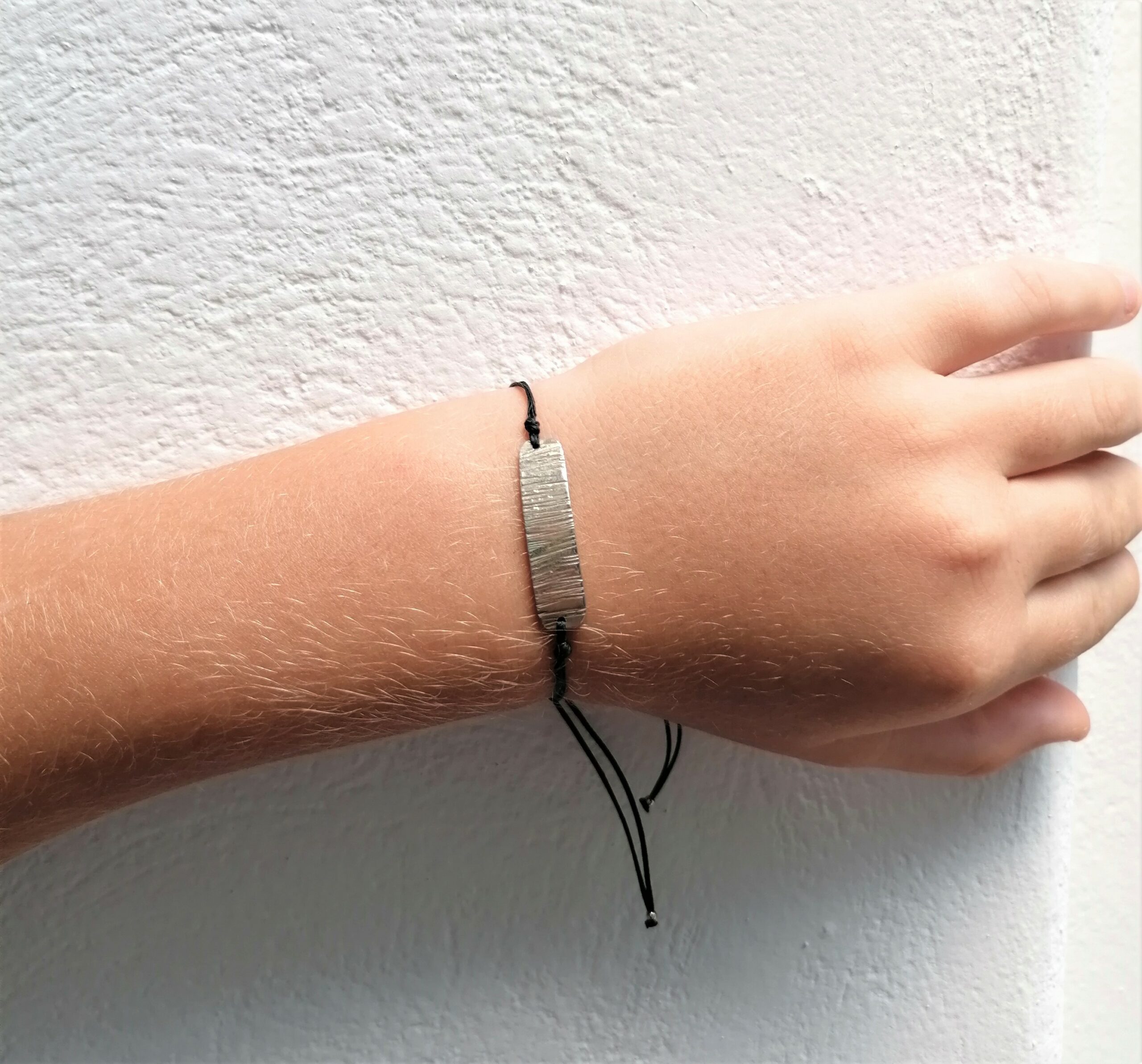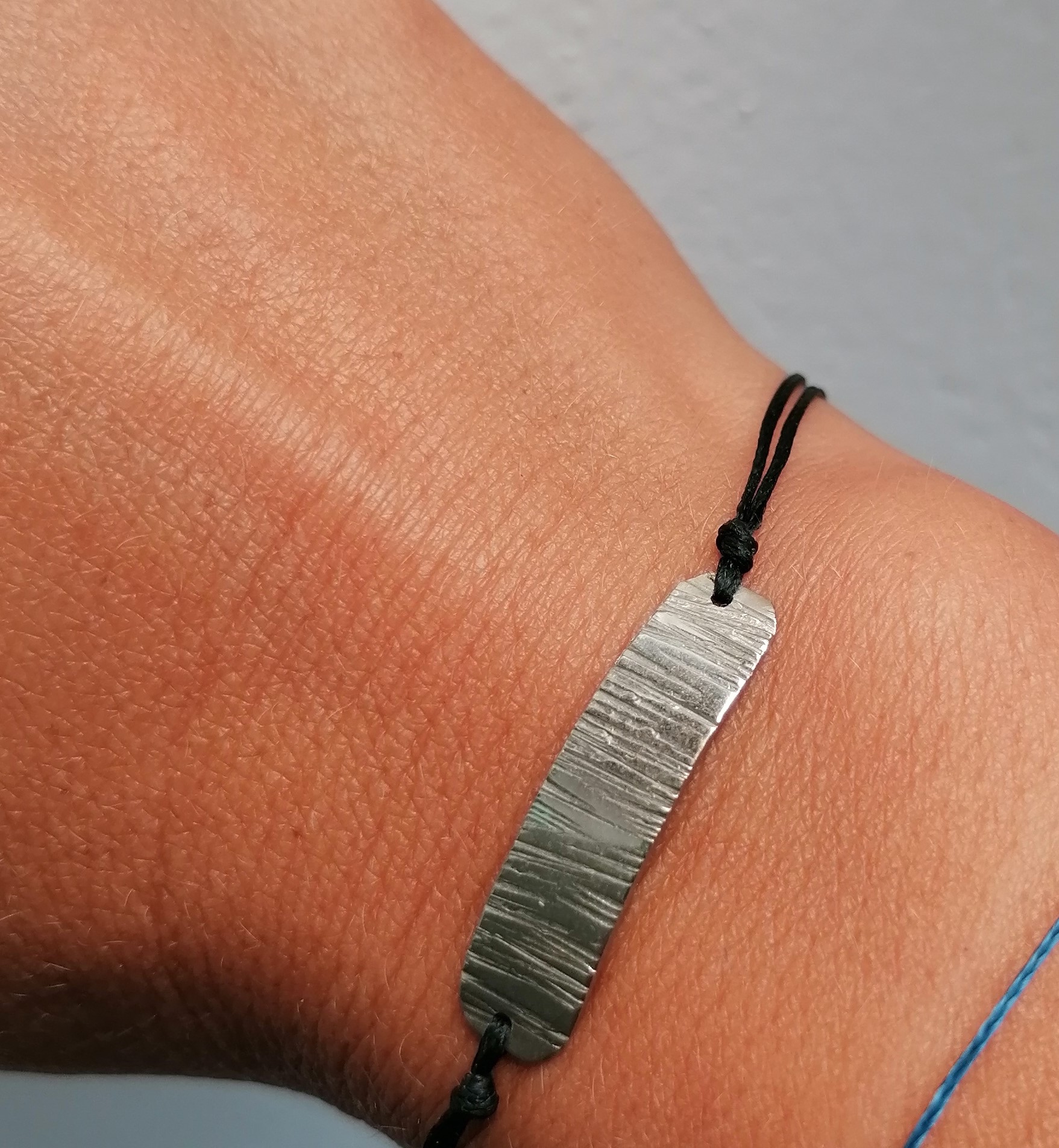 Χειροποίητο βραχιόλι με ασημένια 925 μπάρα, σφυρηλατημένη στο χέρι και ρυθμιζόμενη κηροκλωστές σε μαύρο ή σκούρο μπλέ χρώμα.