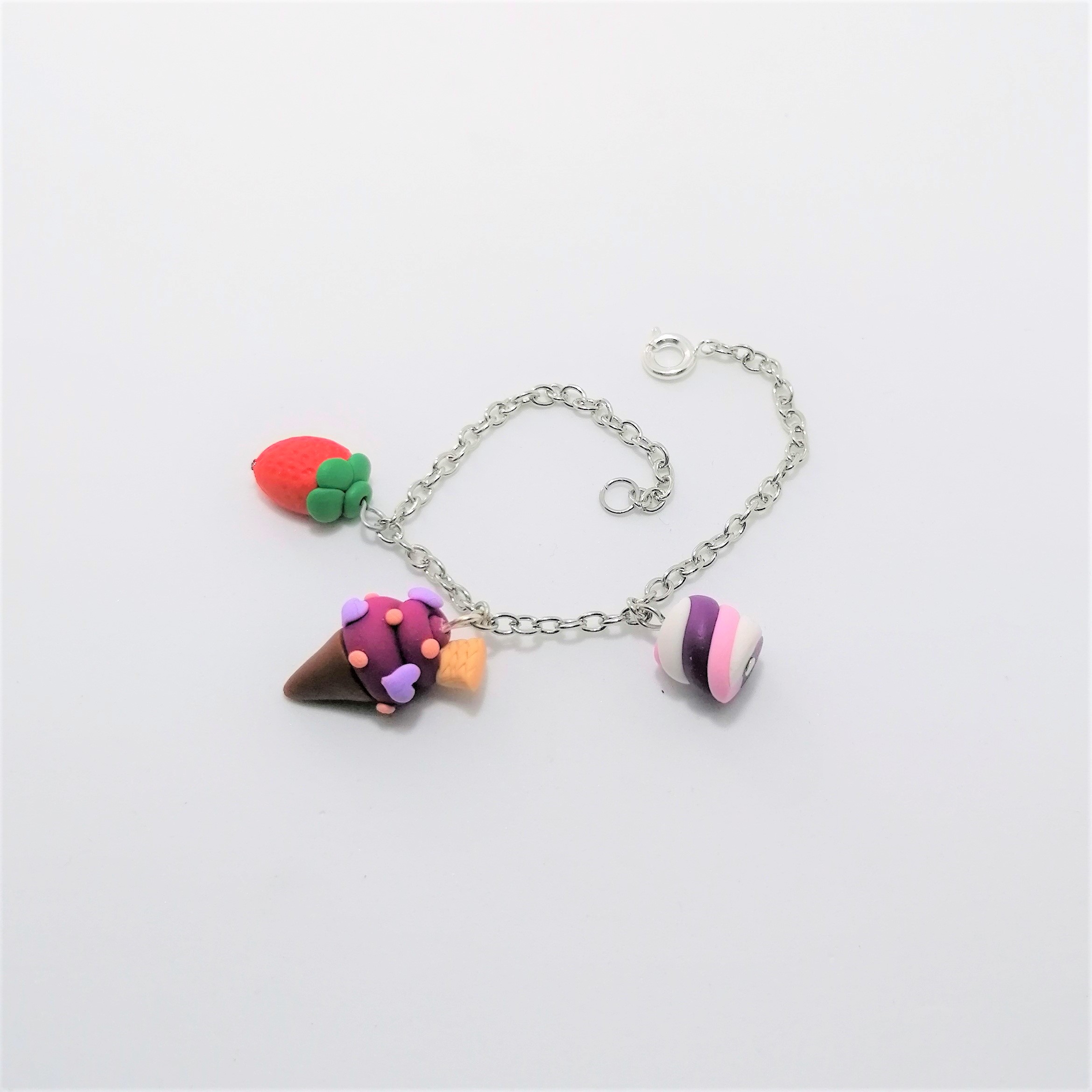 Βραχιόλι με ατσάλινη αλυσίδα και 3 κρεμαστά χειροποίητα στοιχεία απο πολημερικό πηλό: λιλά παγωτό χωνάκι με μωβ καρδιές και μπισκότο, φράουλα και marshmallow.
