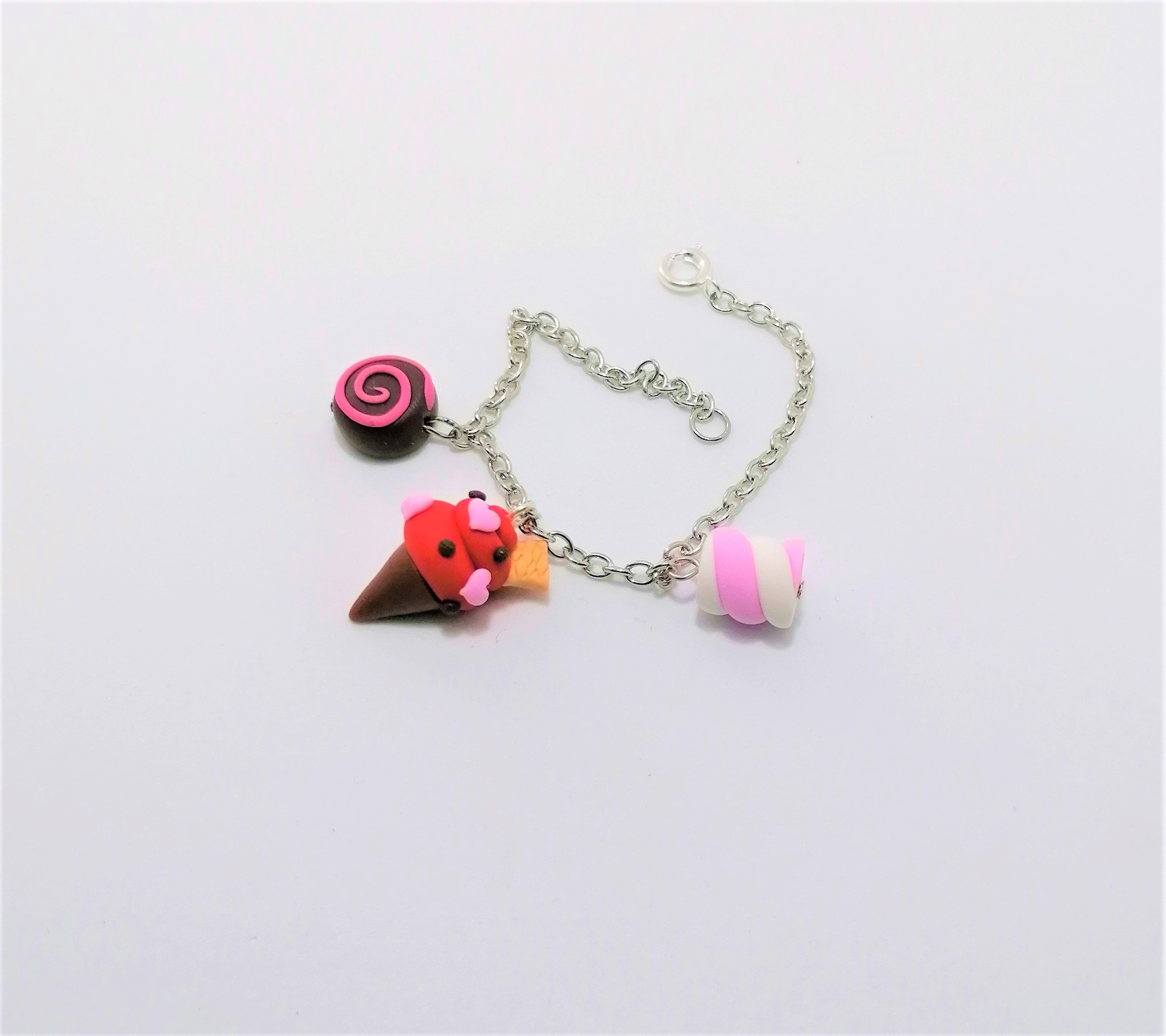 Βραχιόλι με ατσάλινη αλυσίδα και 3 κρεμαστά χειροποίητα στοιχεία απο πολημερικό πηλό: κόκκινο παγωτό χωνάκι με ροζ καρδούλες και μπισκότο, marshmallow και girella sweet.