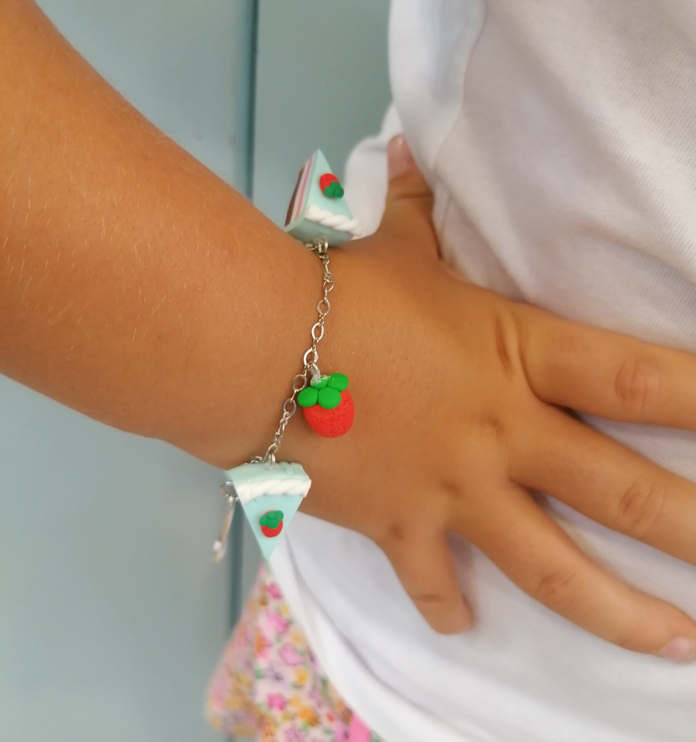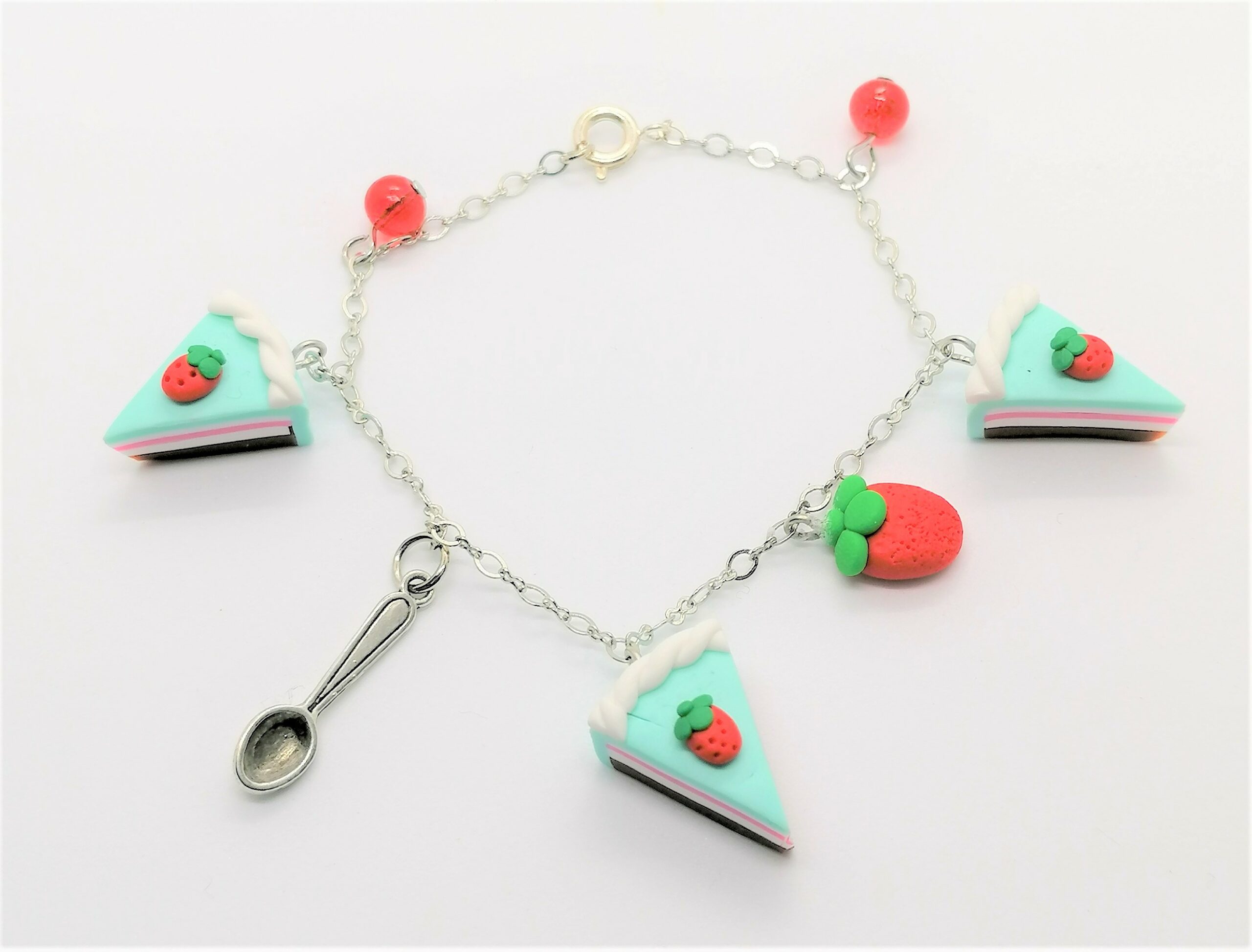 Βραχιόλι με ατσάλινη αλυσίδα και 4 κρεμαστά χειροποίητα στοιχεία απο πολημερικό πηλό: 3 κομμάτια γαλάζιας τούρτας με φραουλίτσα, 1 φράουλα, 2 χάντρες και μικρό μεταλλικό κουταλάκι.