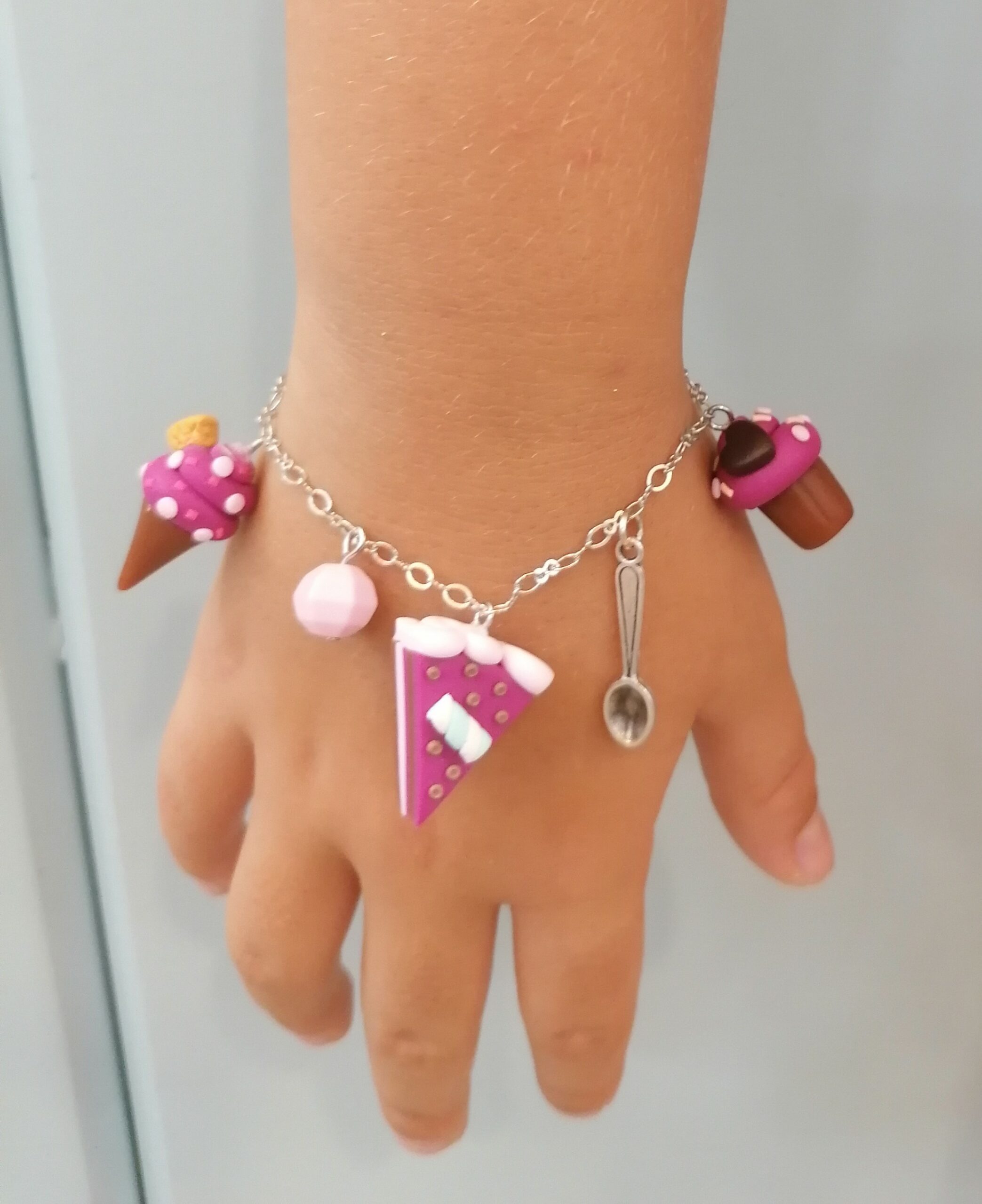 Βραχιόλι με ατσάλινη αλυσίδα και 3 κρεμαστά χειροποίητα στοιχεία απο πολημερικό πηλό (λιλά cupcake,  λιλά κομμάτι τούρτας, λιλά παγωτό χωνάκι), 3 χάντρες και 1 μεταλλικό κουταλάκι.