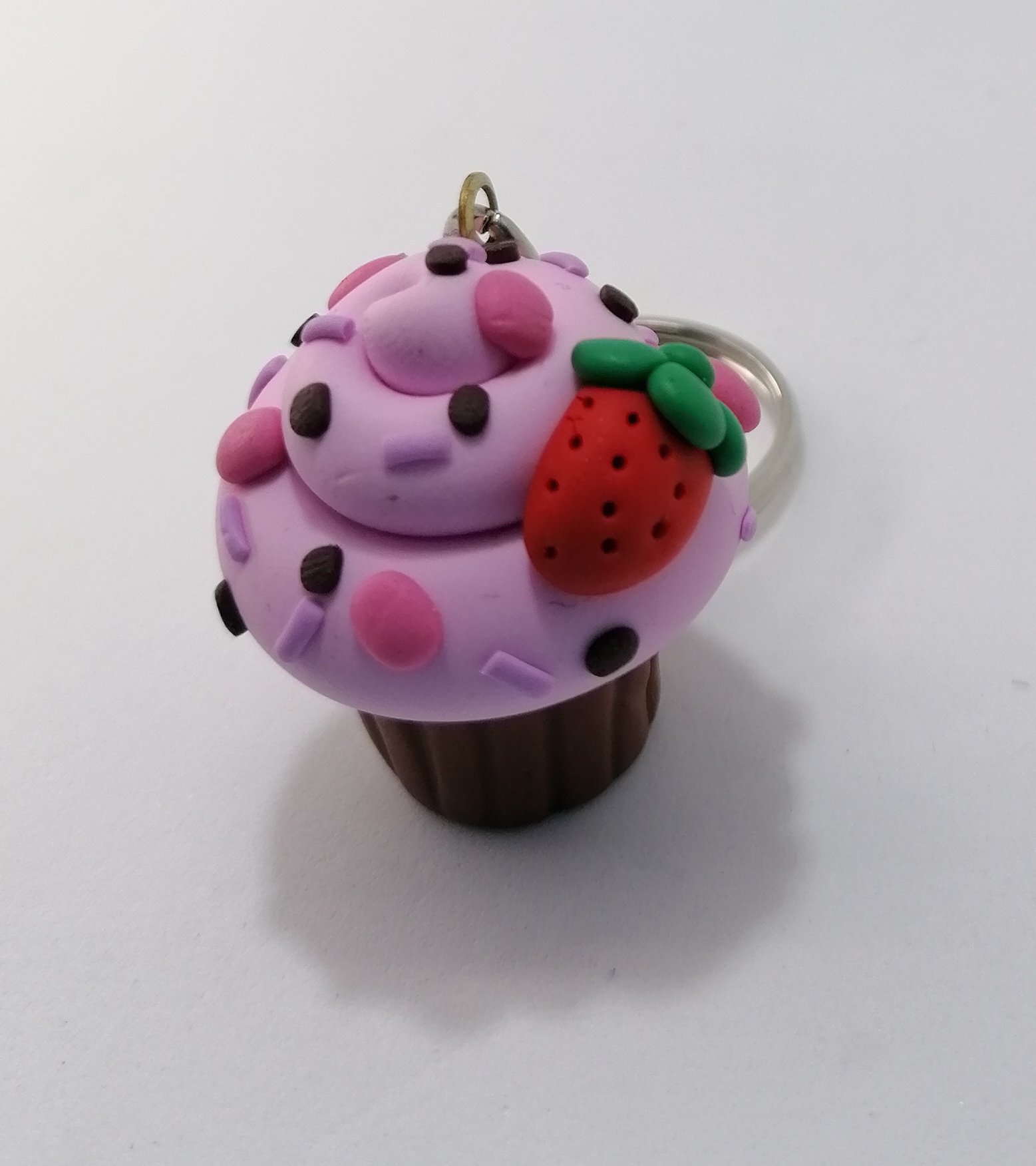 Χειροποίητο μπρελόκ απο πολυμερικό πηλό, ροζ cupcake με φραουλίτσα πασπαλισμένο με χρωματιστά ζαχαρωτά.