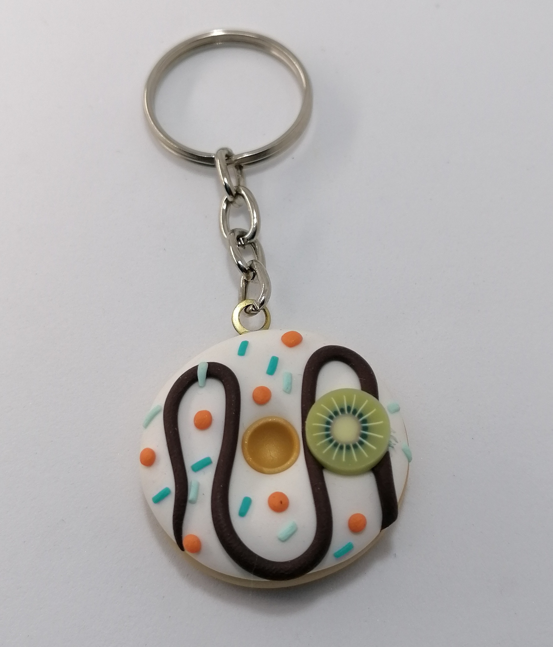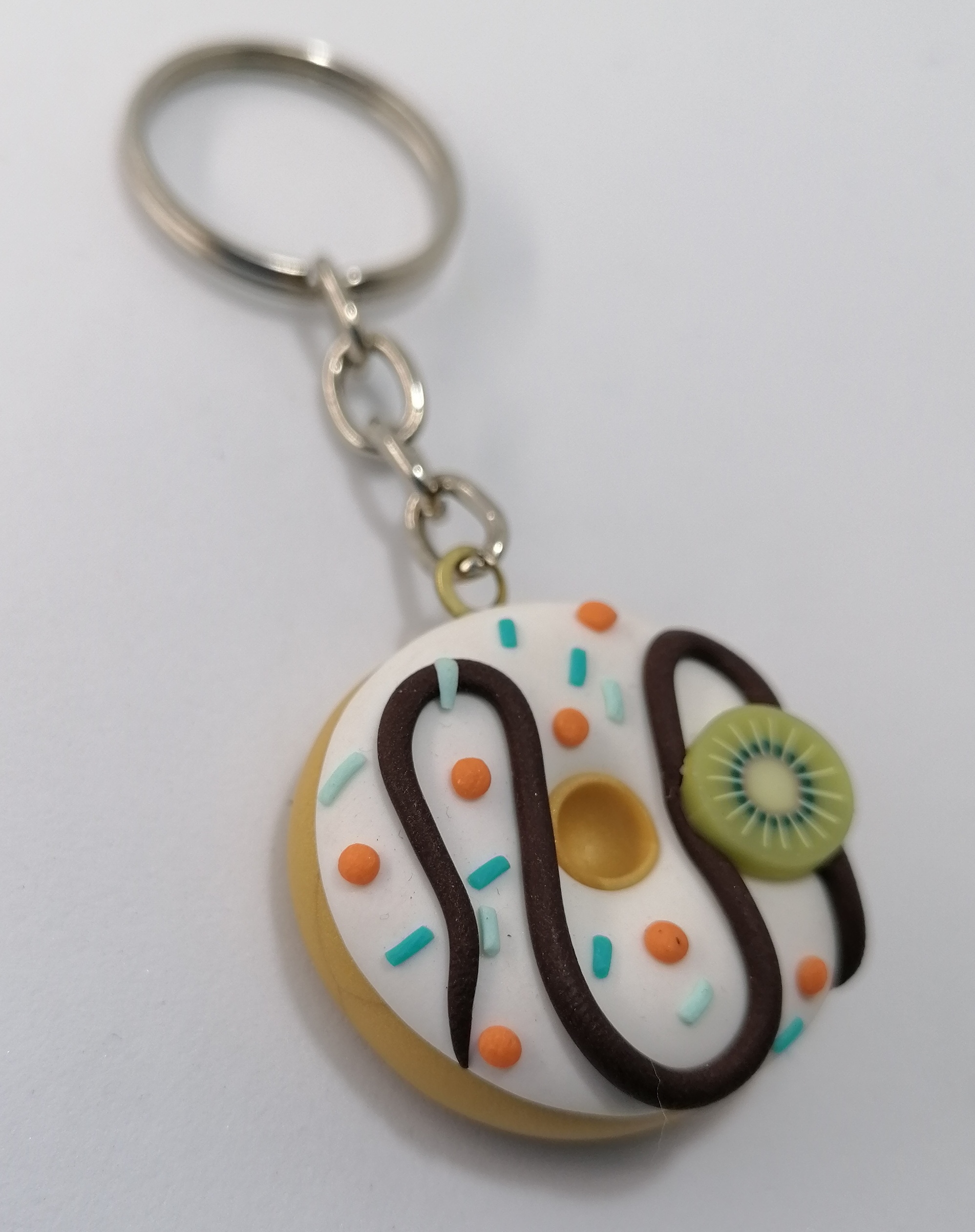 Χειροποίητο μπρελόκ απο πολυμερικό πηλό, λευκό donut με φέτα ακτινίδιο, πασπαλισμένο με χρωματιστά ζαχαρωτά.