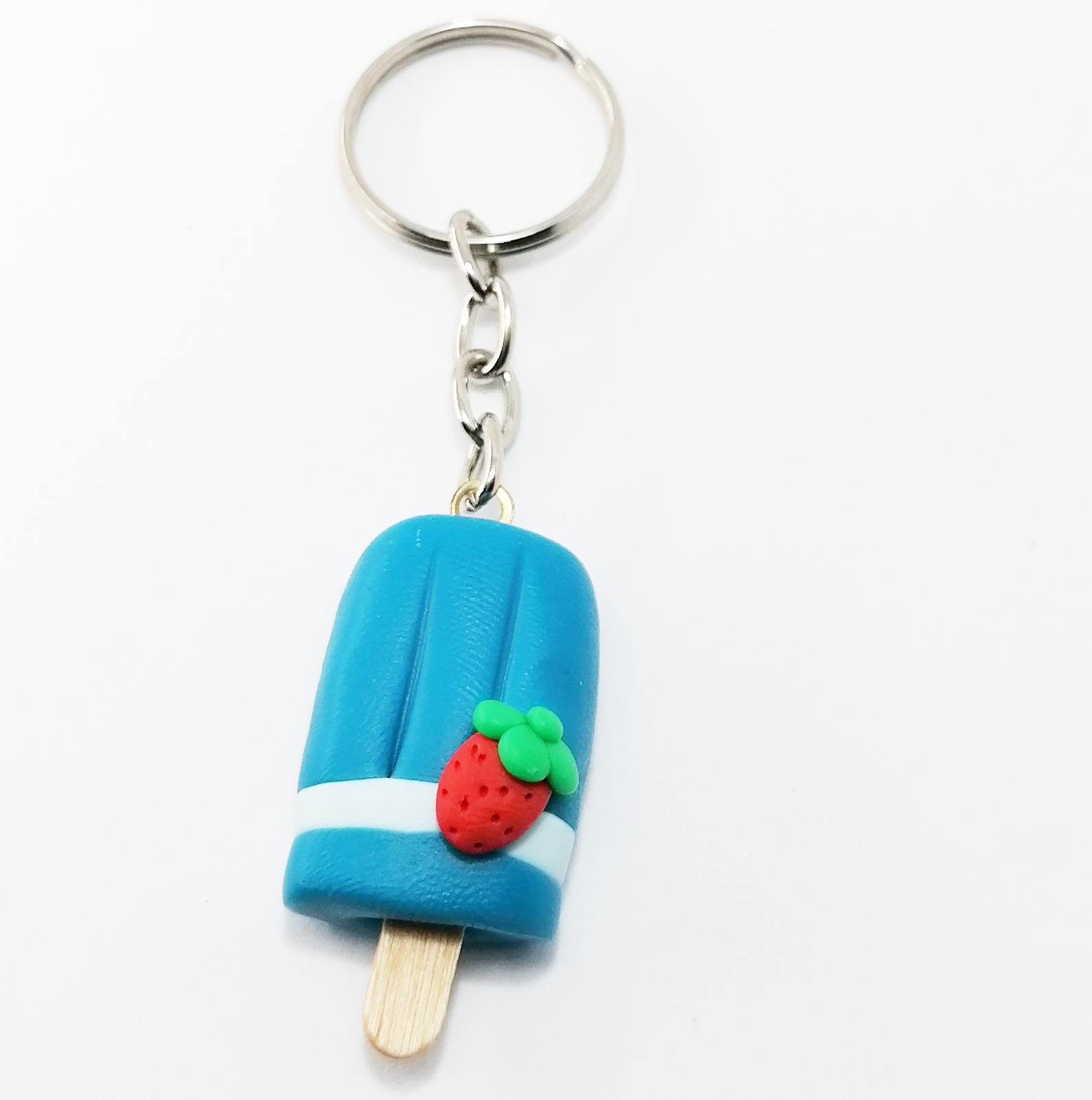 Χειροποίητο μπρελόκ απο πολυμερικό πηλό, μλέ παγωτό ξυλάκι με φραουλίτσα.