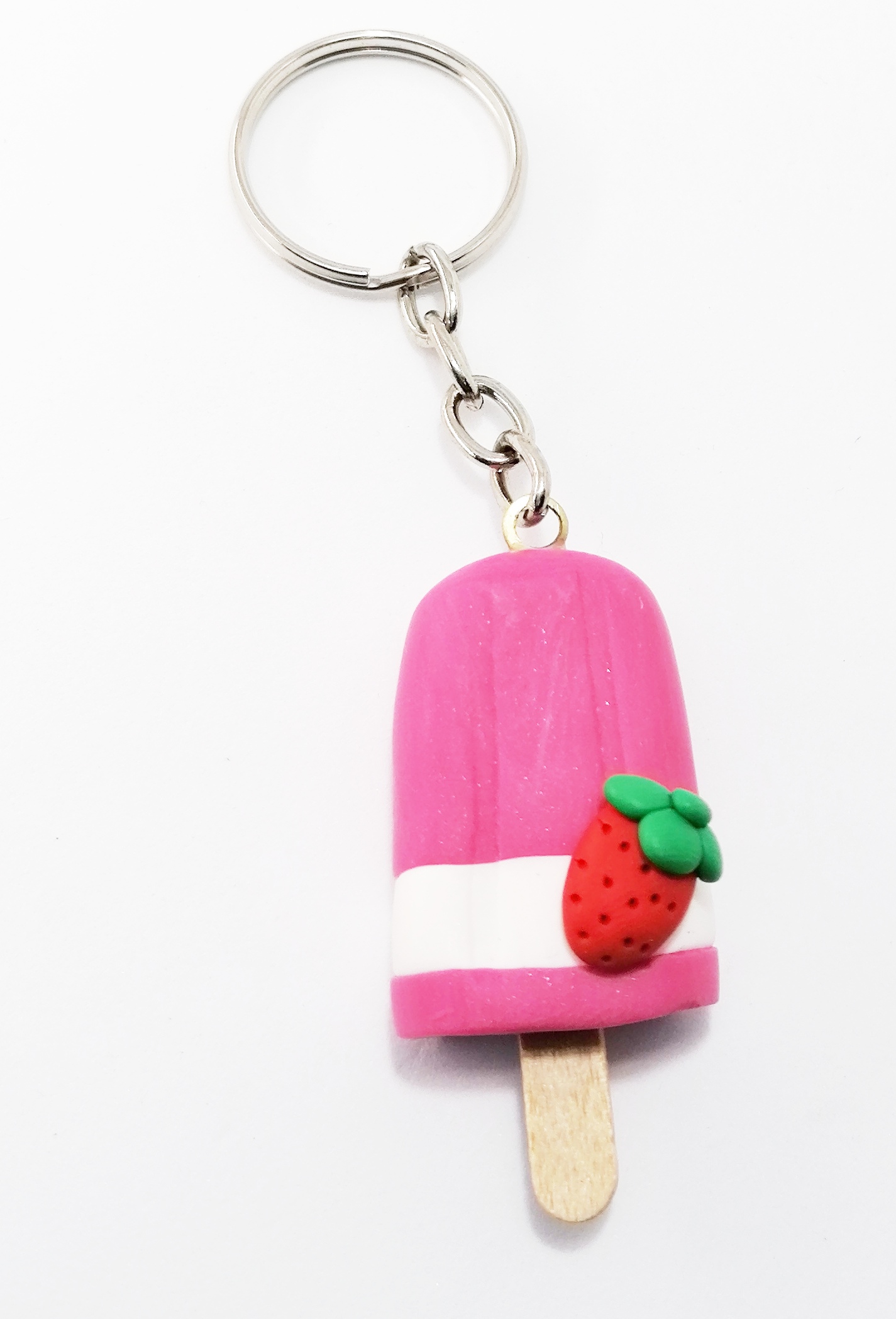 Χειροποίητο μπρελόκ απο πολυμερικό πηλό, φούξια παγωτό ξυλάκι με φραουλίτσα.