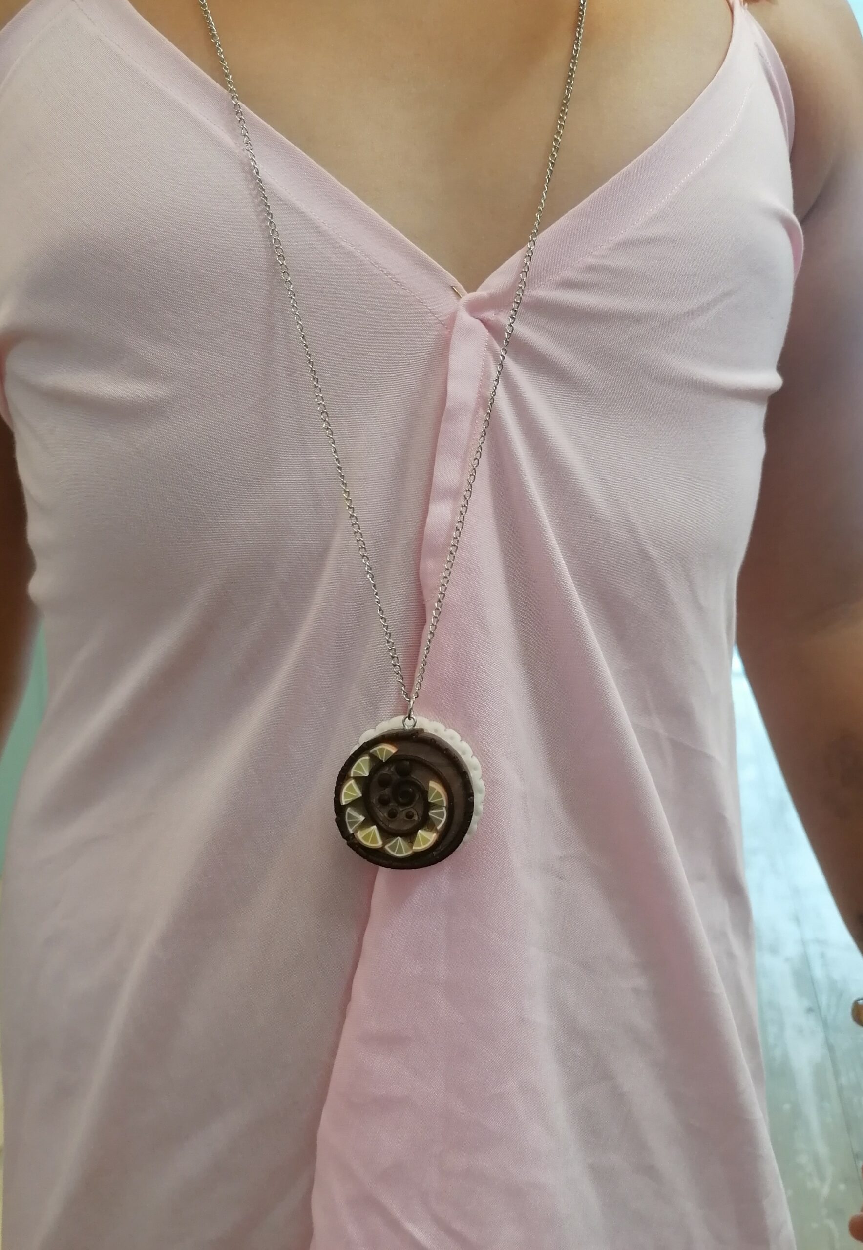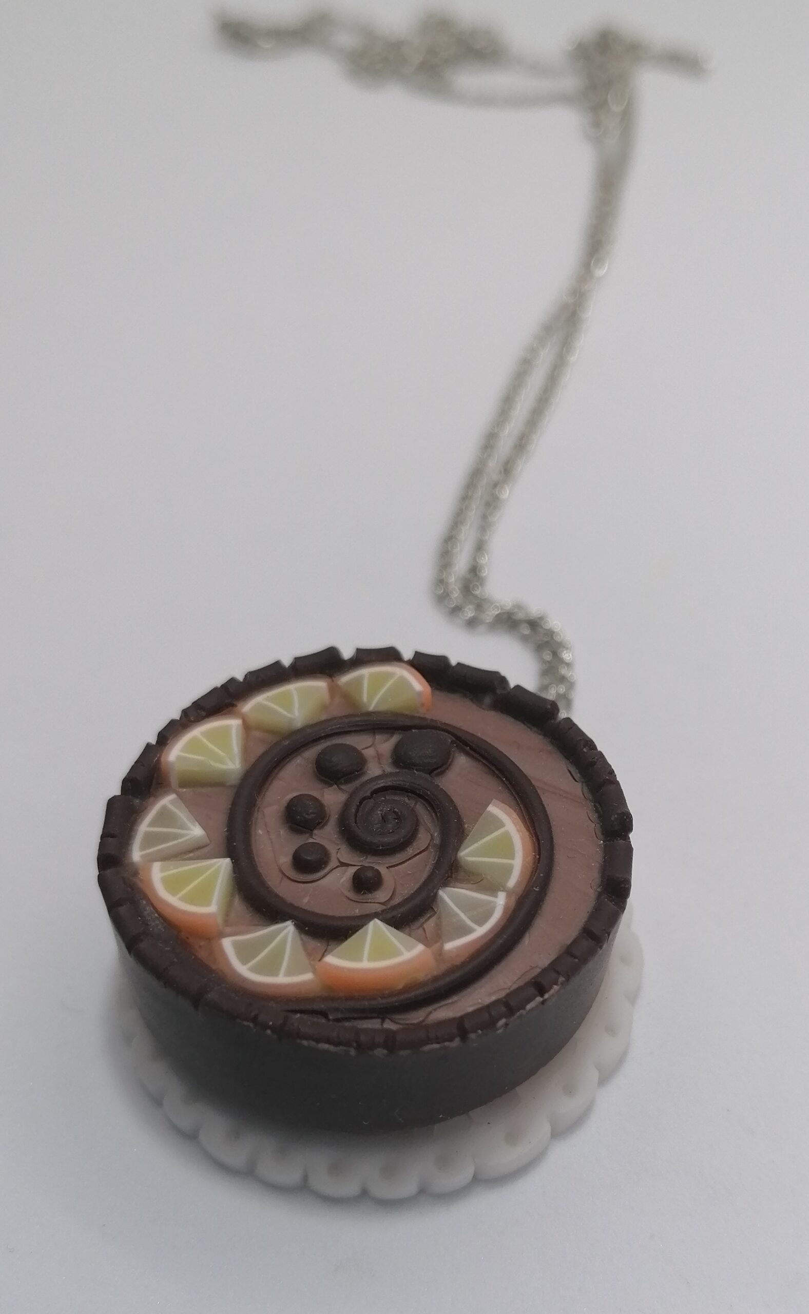 Κολιέ με ατσάλινη αλυσίδα και χειροποίητο κρεμαστό στοιχείο απο πολυμερικό πηλό, τούρτα σοκολάτα με φέτες πορτοκάλι.