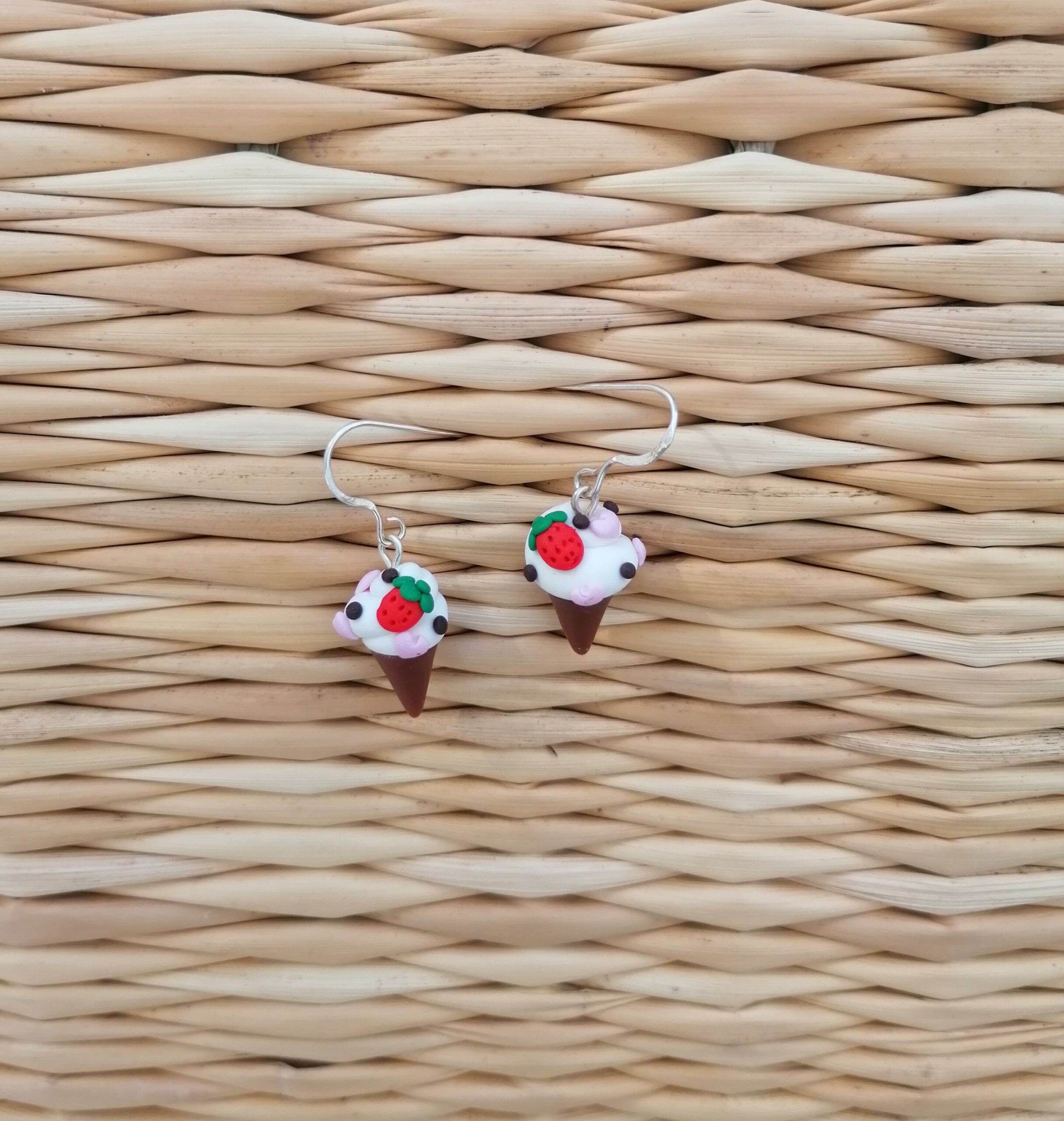 Χειροπίητα κρεμαστά σκουλαρίκια απο πολυμερικό πηλό παγωτό χωνάκι βανίλια με φραουλίτσα. Το γαντζάκι που μπαίνει στο αυτί είναι απο ασήμι 925.