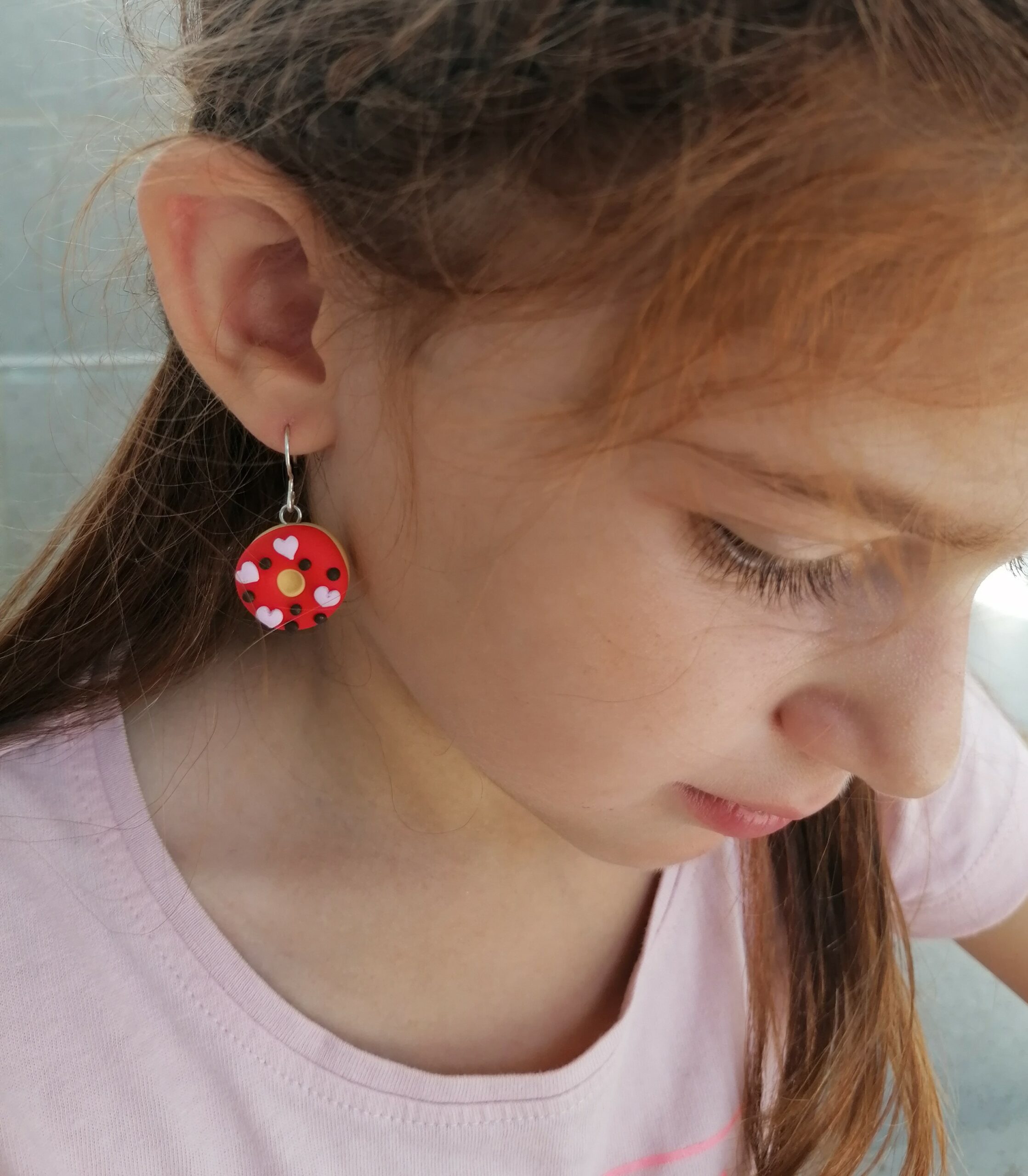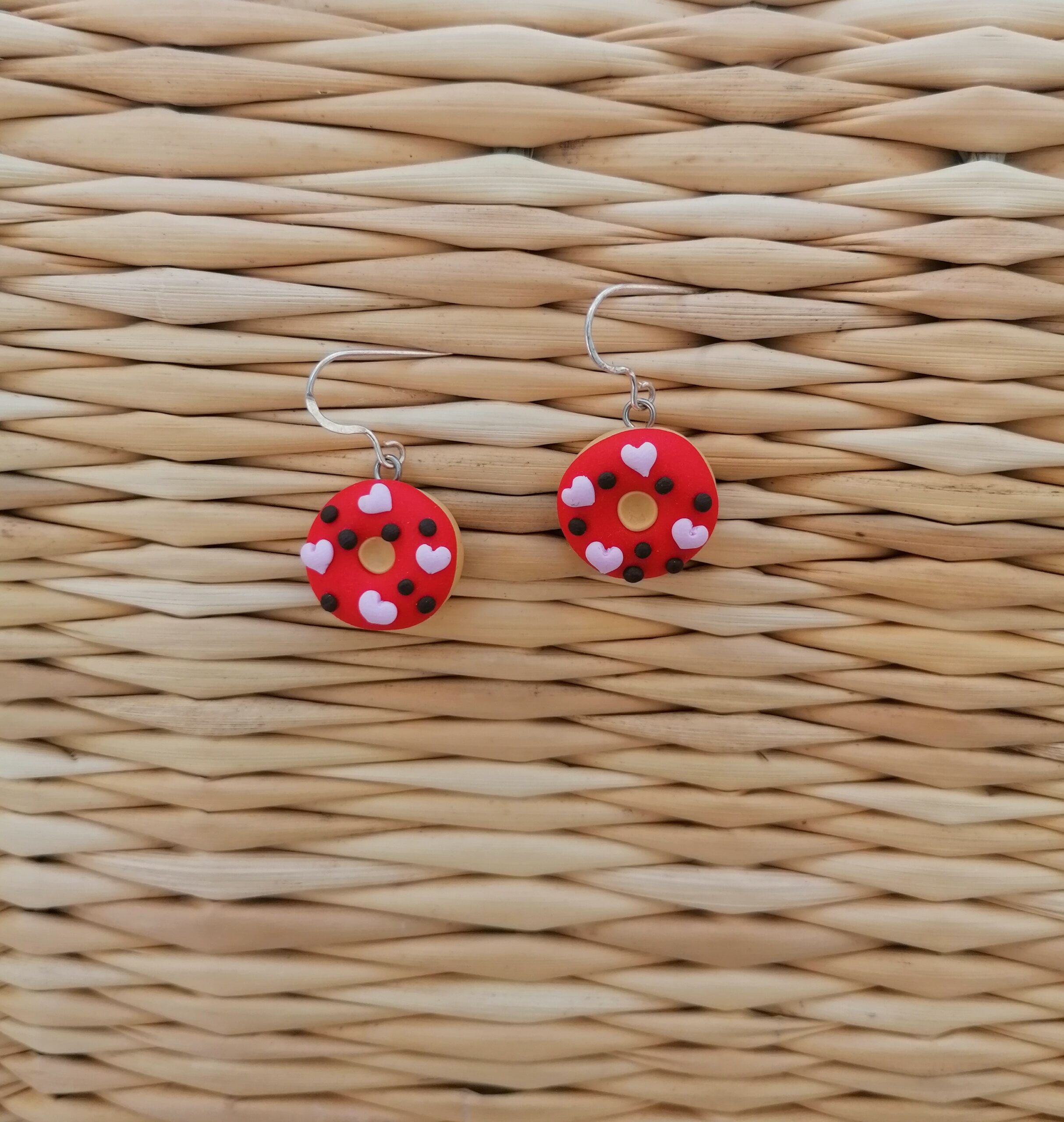 Χειροπίητα κρεμαστά σκουλαρίκια απο πολυμερικό πηλό, κόκκινο donut με ροζ καρδούλες. Το καρφάκι που μπαίνει στο αυτί είναι απο ασήμι 925.