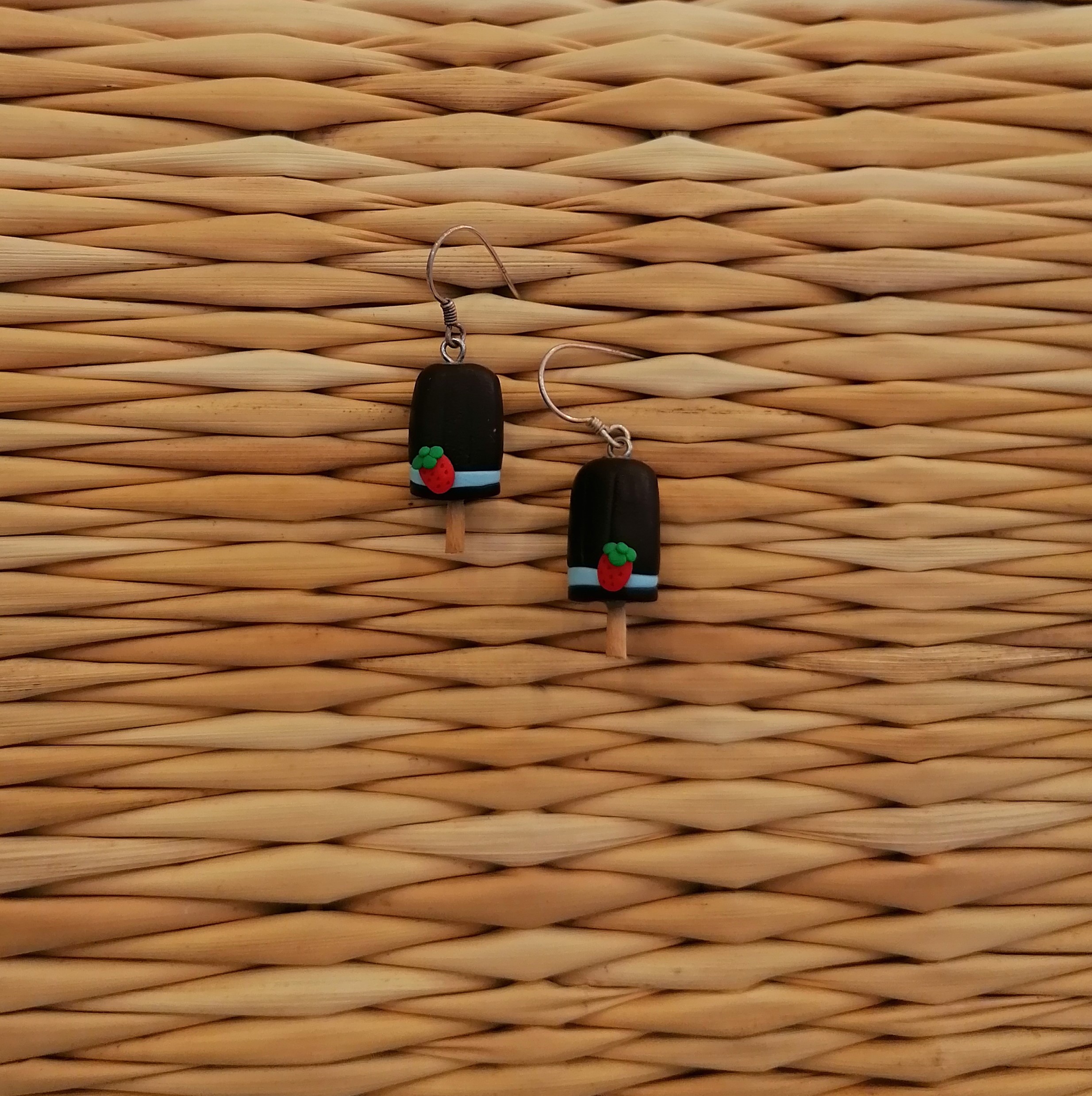 Χειροποίητα κρεμαστά σκουλαρίκια απο πολυμερικό πηλό, παγωτό ξυλάκι σοκολάτα με φραουλίτσα. Το γαντζάκι που μπαίνει στο αυτί ειναι απο ασήμι 925.