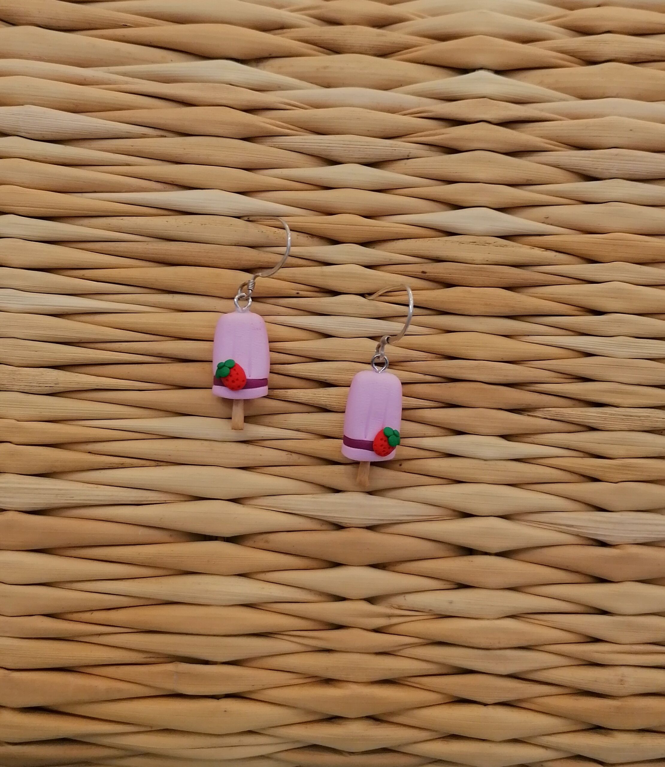 Χειροποίητα κρεμαστά σκουλαρίκια απο πολυμερικό πηλό, ροζ παγωτό ξυλάκι σοκολάτα με φραουλίτσα. Το γαντζάκι που μπαίνει στο αυτί ειναι απο ασήμι 925.