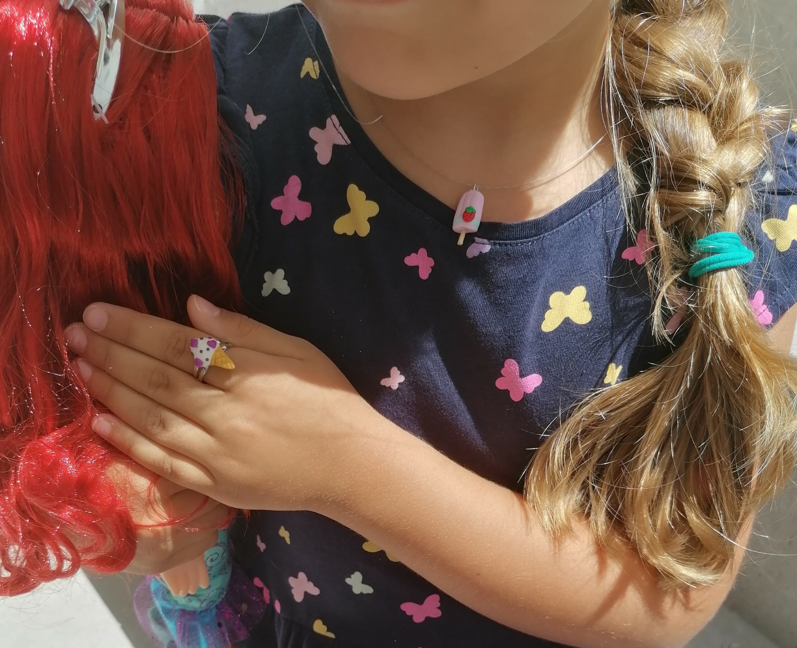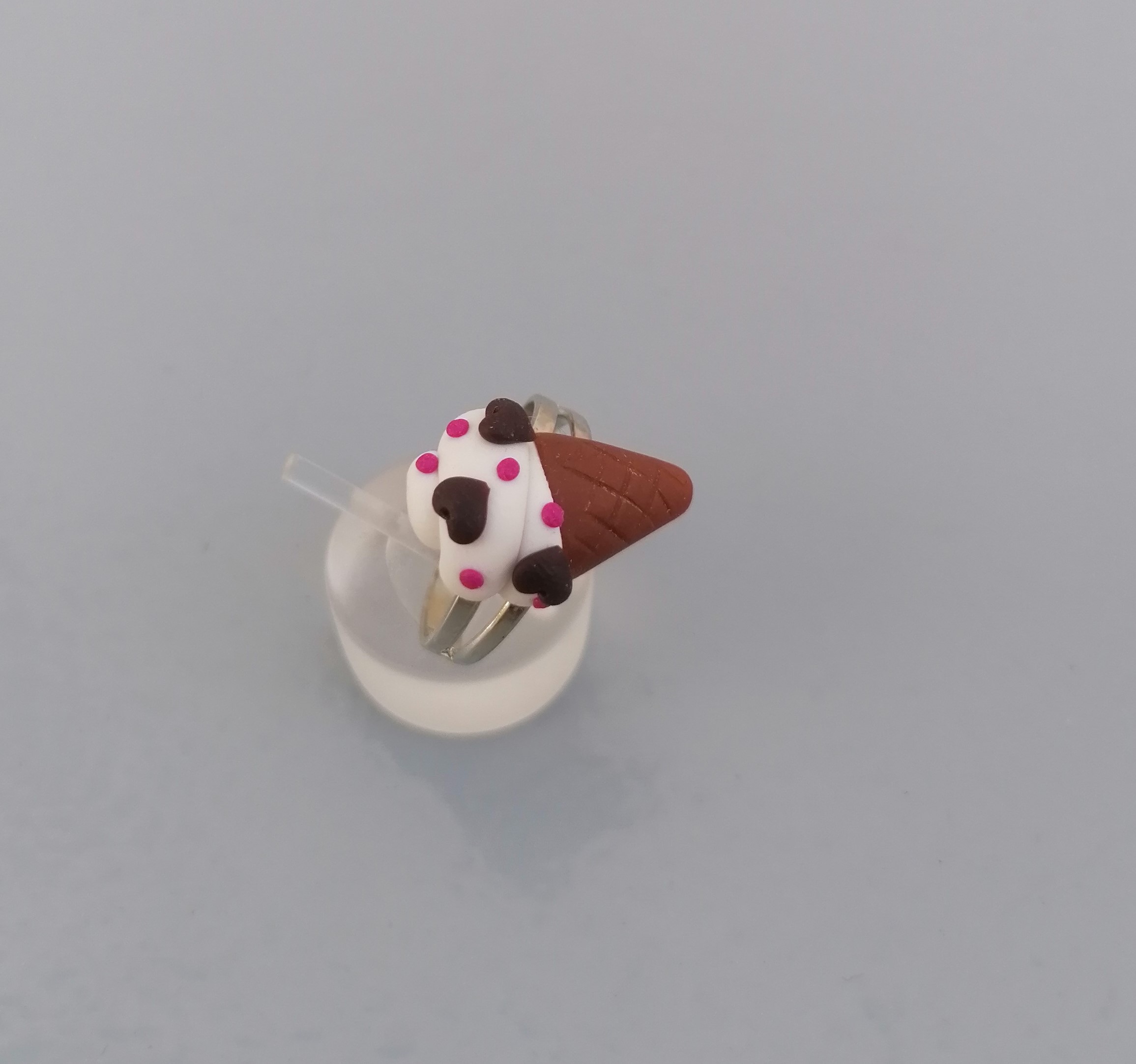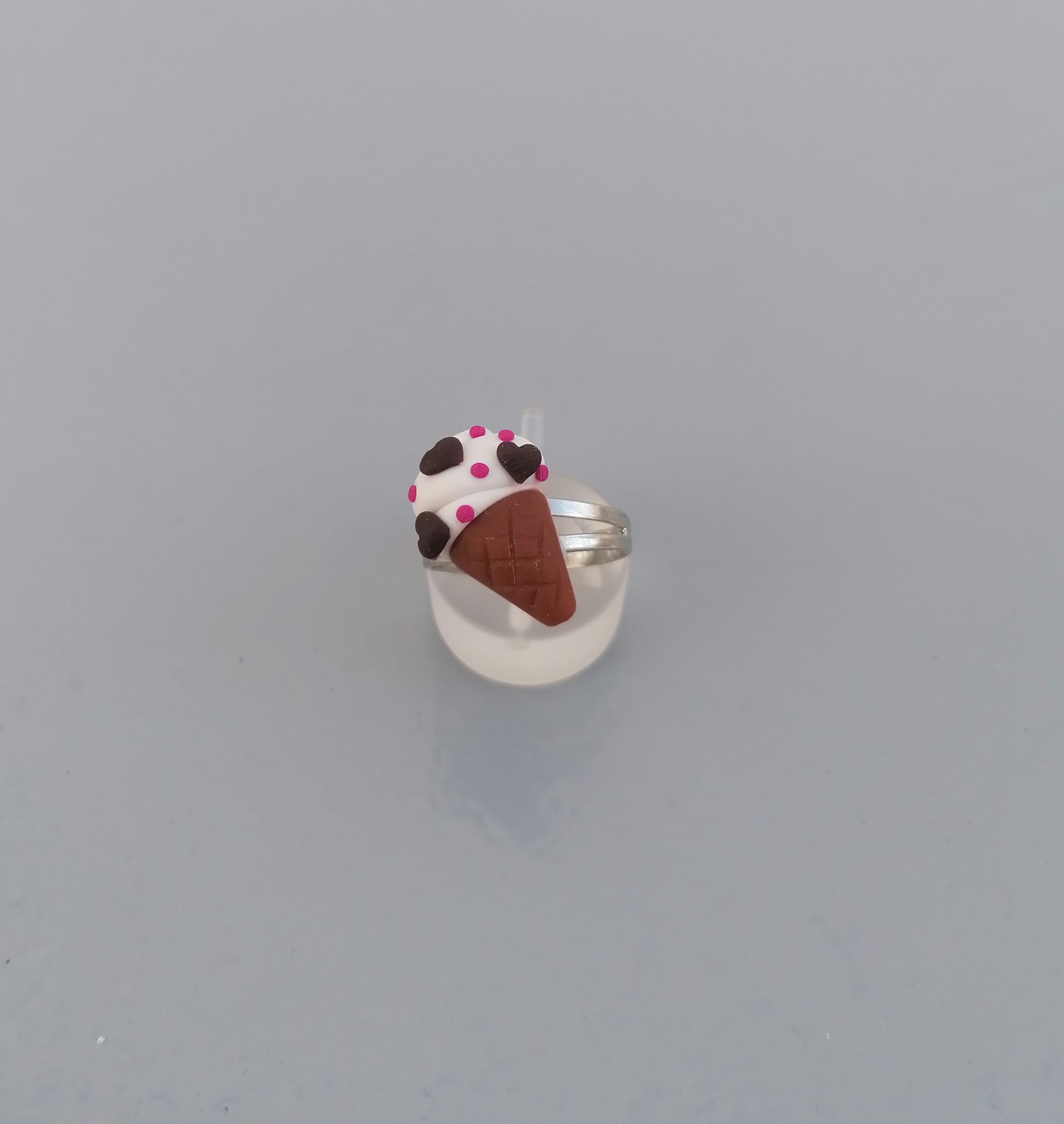 Ρυθμιζόμενο δαχτυλίδι με χειροποίητη μινιατούρα απο πολυμερικό πηλό, λευκό παγωτό χωνάκι με σοκολατί καρδούλες και πασπαλισμένα ροζ ζαχαρωτά.
