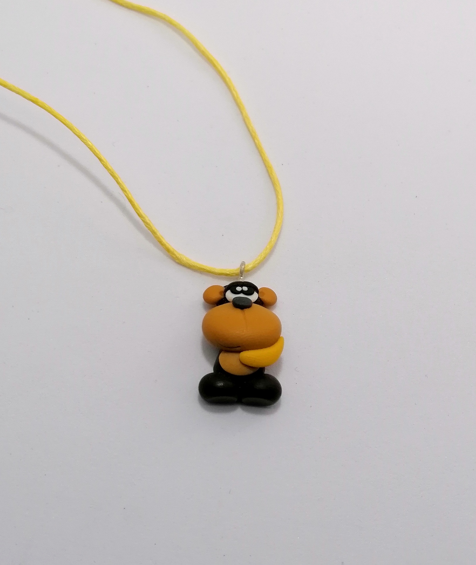 Κολιέ με χειροποίητη μινιατούρα απο πολυμερικό πηλό, πίθηκος με μπανάνα. Επιλέξτε παρακάτω αν η μινιατούρα σας θα κρέμεται σε ρυθμιζόμενο βαμβακερό κορδόνι ή σε ατσαλόσυρμα 36cm.
