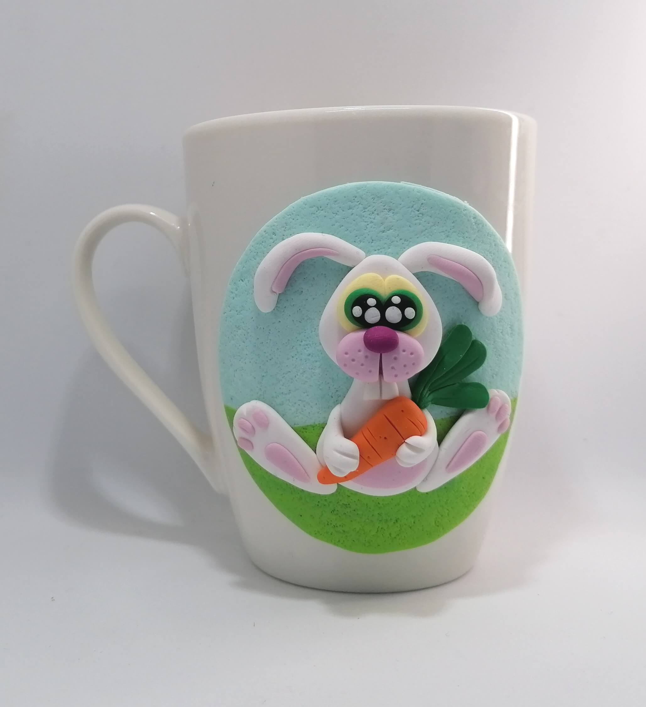 Κούπα διακοσμημένη με χειροποίητα στοιχεία απο πολυμερικό πηλό, παραπονεμένο κουνελάκι που κρατά καρότο.