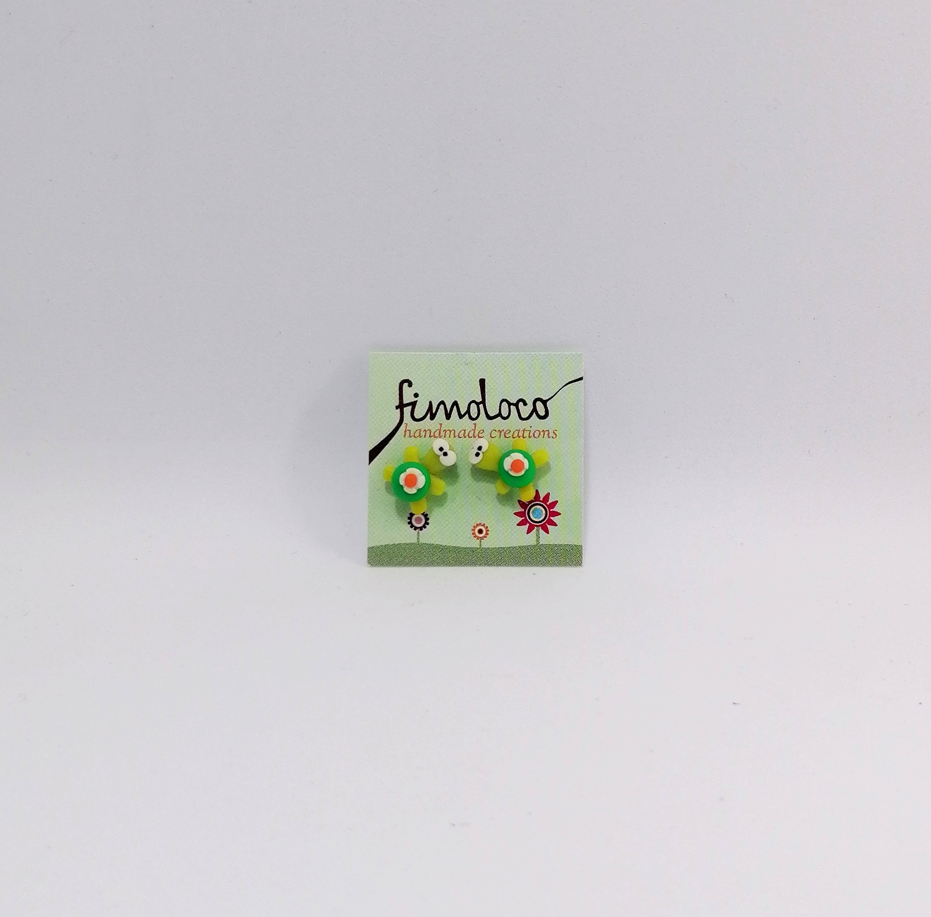 Χειροποίητα μικροσκοπικά σκουλαρίκα λοβού απο πολυμερικό πηλό, πράσινες χελωνίτσες με λουλουδάκι στο καβούκι. Τα καρφάκια που μπαίνουν στο αυτί είναι μέταλλο χωρίς νίκελ, το κούμπωμα είναι απο διάφανη σιλικόνη.