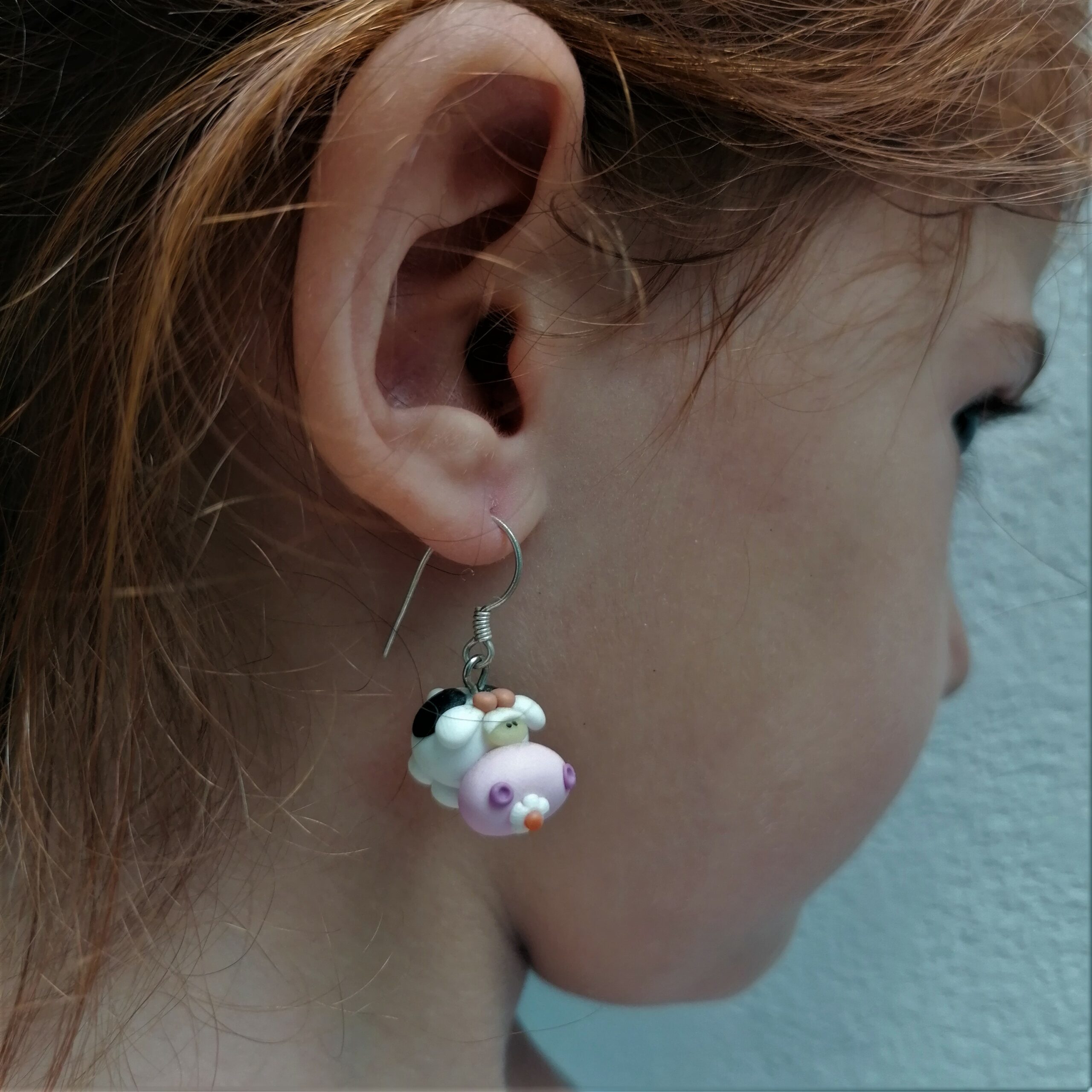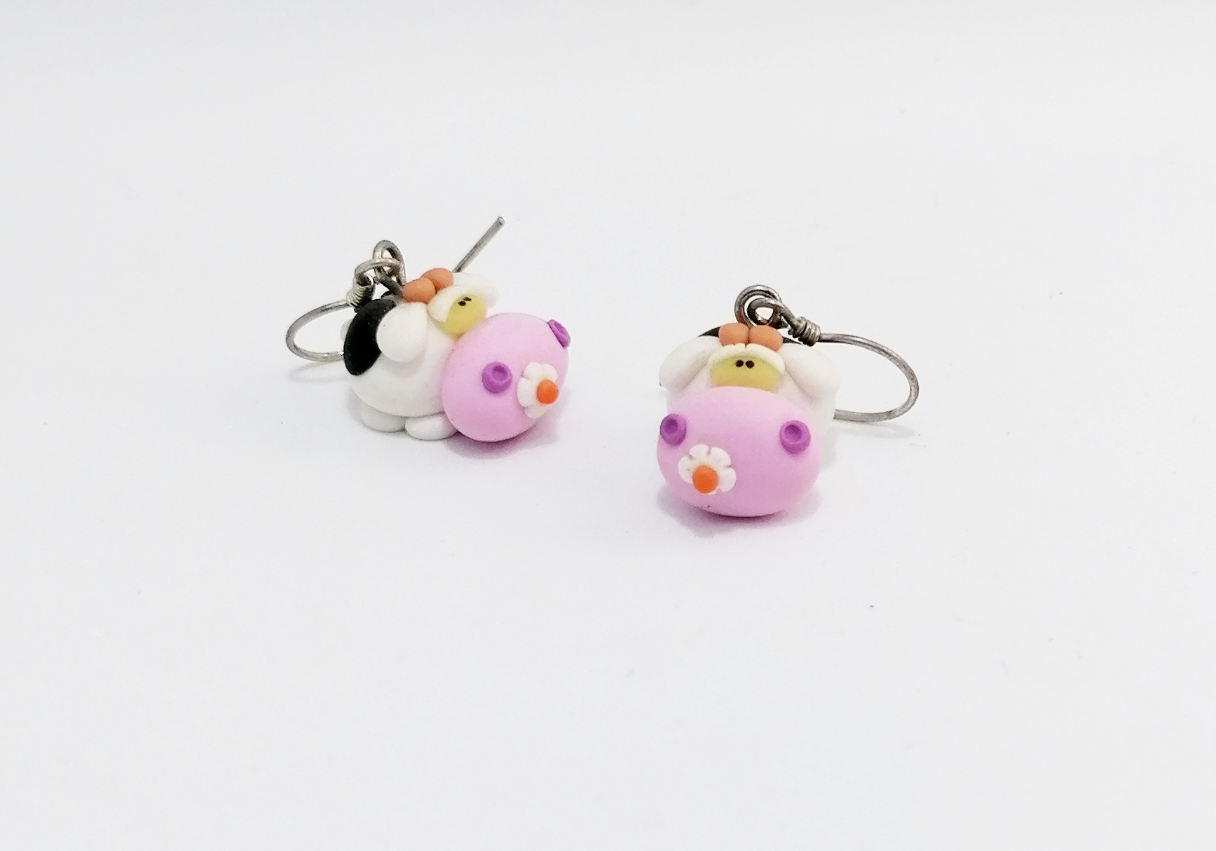 Χειροποίητα κρεμαστά σκουλαρίκια απο πολυμερικό πηλό, αγελαδίτσες με λουλούδι στην μουσούδα. Το γαντζάκι είναι απο ασήμι 925.