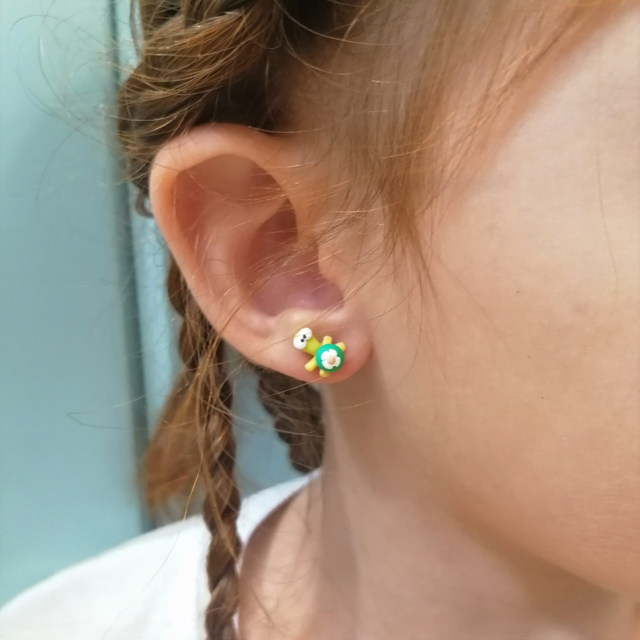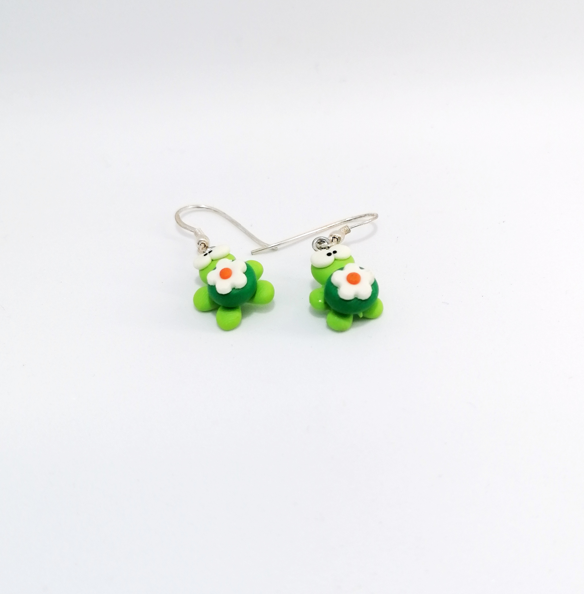 Χειροποίητα κρεμαστά σκουλαρίκια απο πολυμερικό πηλό, πράσινες χελωνίτσες με λουλουδάκι στο καβούκι τους. Το γαντζάκι είναι απο ασήμι 925.