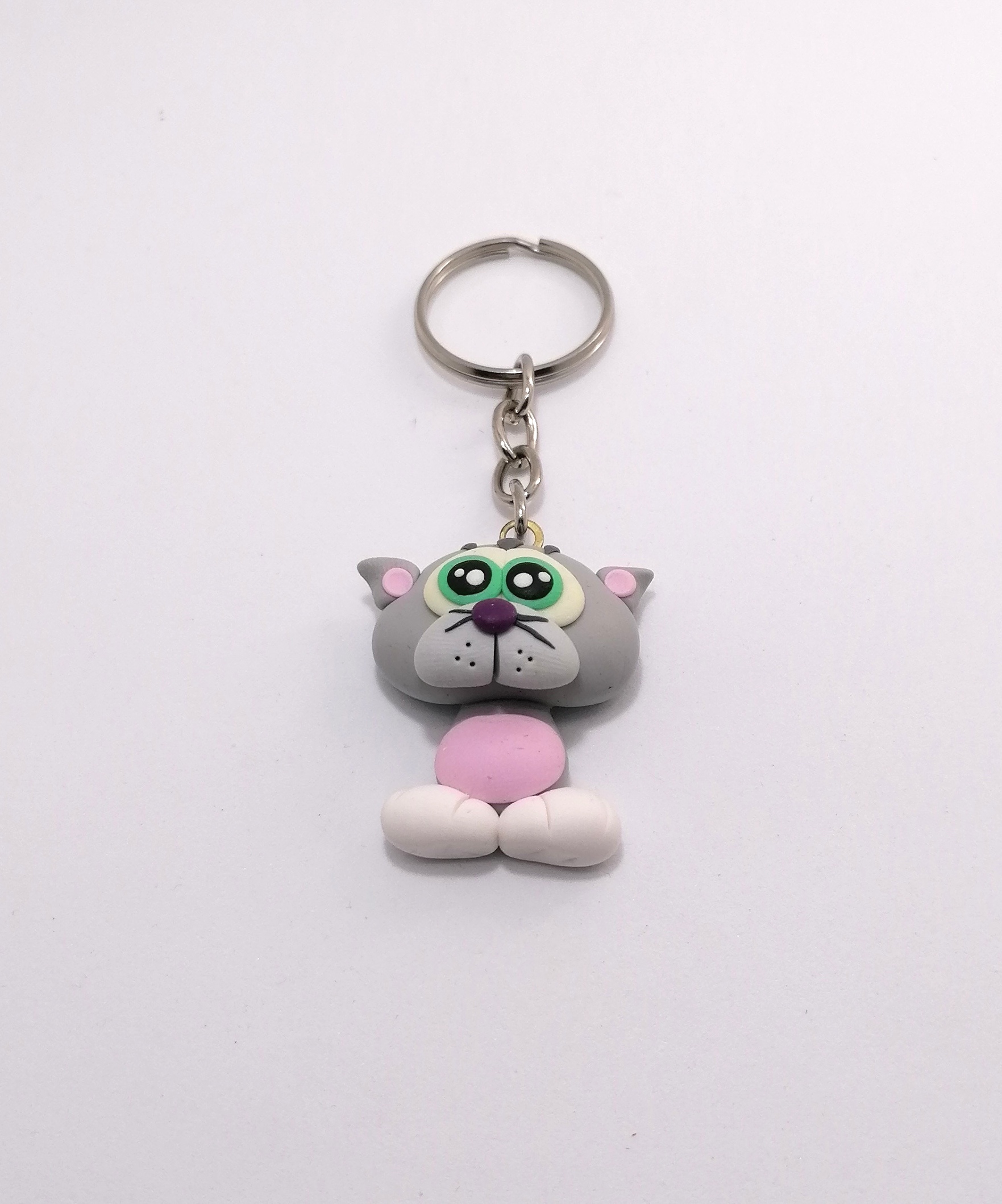 Χειροποίητο μπρελόκ απο πολυμερικό πηλό, γκρί γάτα με χαριτωμένα ματάκια.